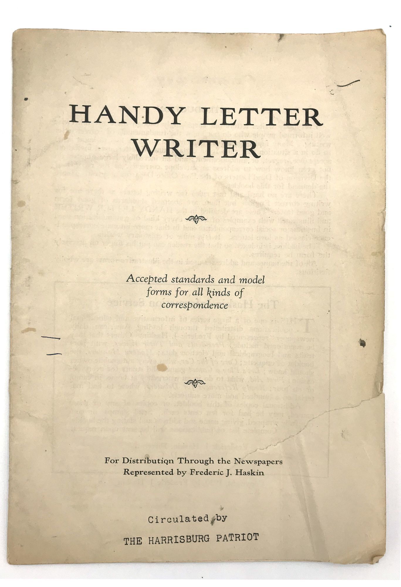 Washington, D.C.: Frederick J. Haskin, 1930. Very good; some dust soiling, one short tear to right-hand margin of upper wrapper, touching text.. An expansive 1930s letter writer with examples appropriate for a myriad of situations, including: "To Collect a Debt"; "To Write a Letter to a Servant"; "Invitation to a Christening"; "Asking a Lover to Wait"; and even "Breaking an Engagement" (which begins quite bluntly: "Our engagement has been a terrible mistake."). Also includes general guidance for grammar, diction, etc. The writer was intended "For Distribution Through the Newspapers Presented by Frederic J. Haskin"; this particular copy has an ink stamp noting that it was "Circulated by The Harrisburg Patriot".
