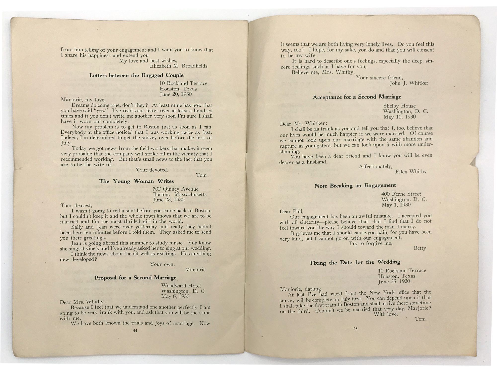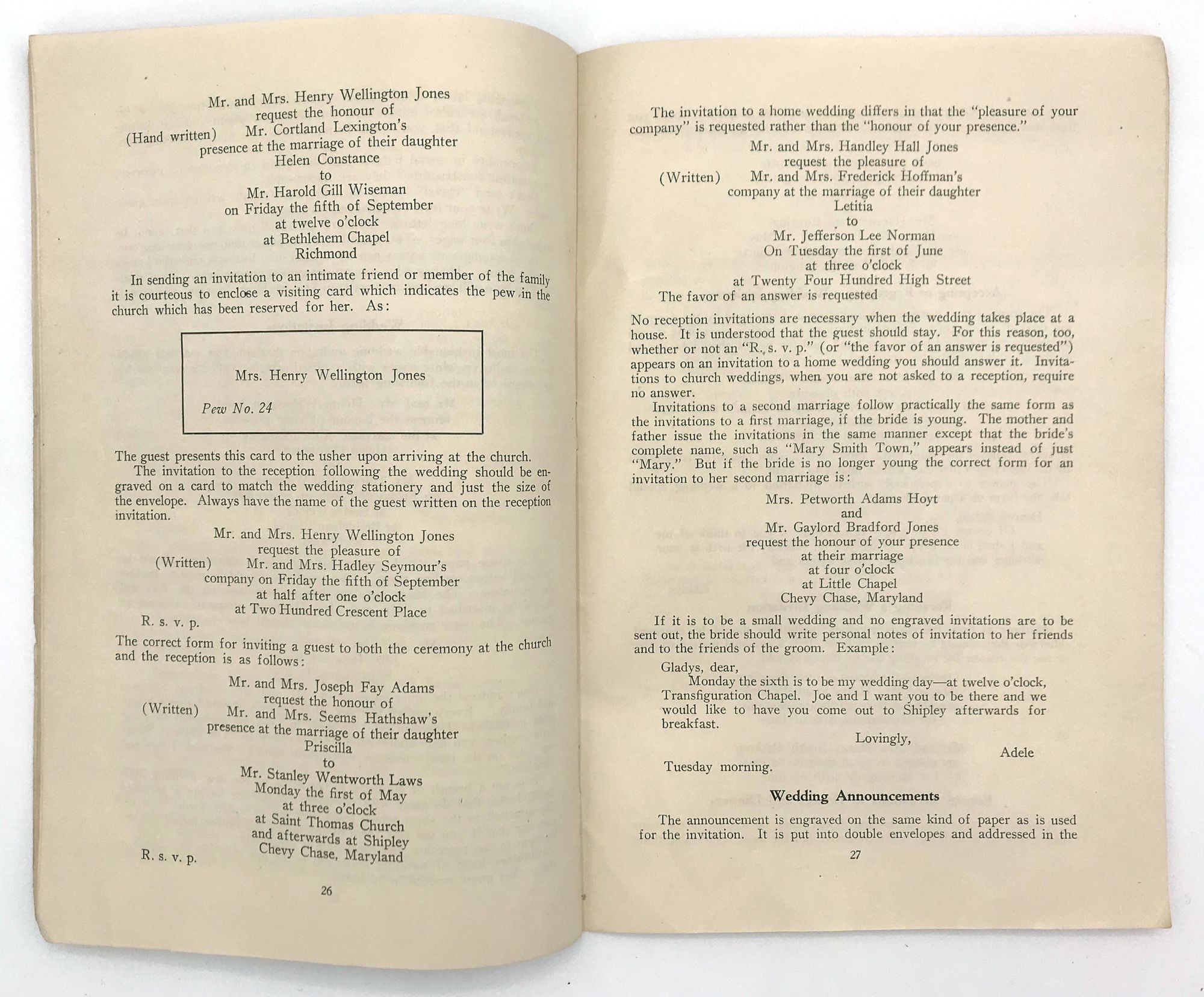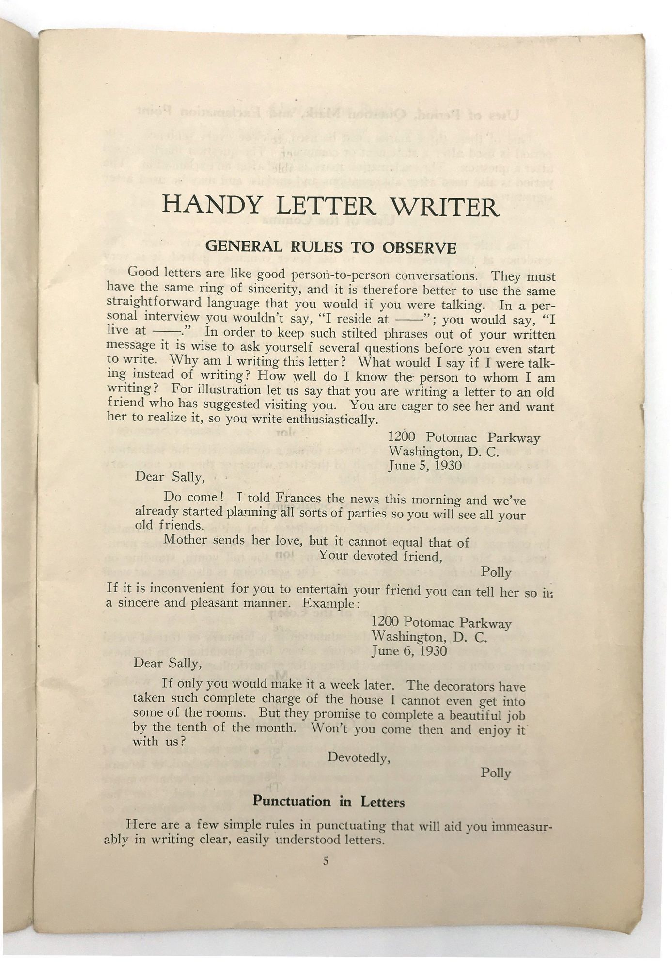 8vo (9" by 6"), 48 pp., unbound as issued. Designed to teach the fundamentals of correct letter writing in any situation. Contents includes General Rules to Observe, Business letters, Social Letters, Lover Letters and Correct Form of Addressing Important Personages.