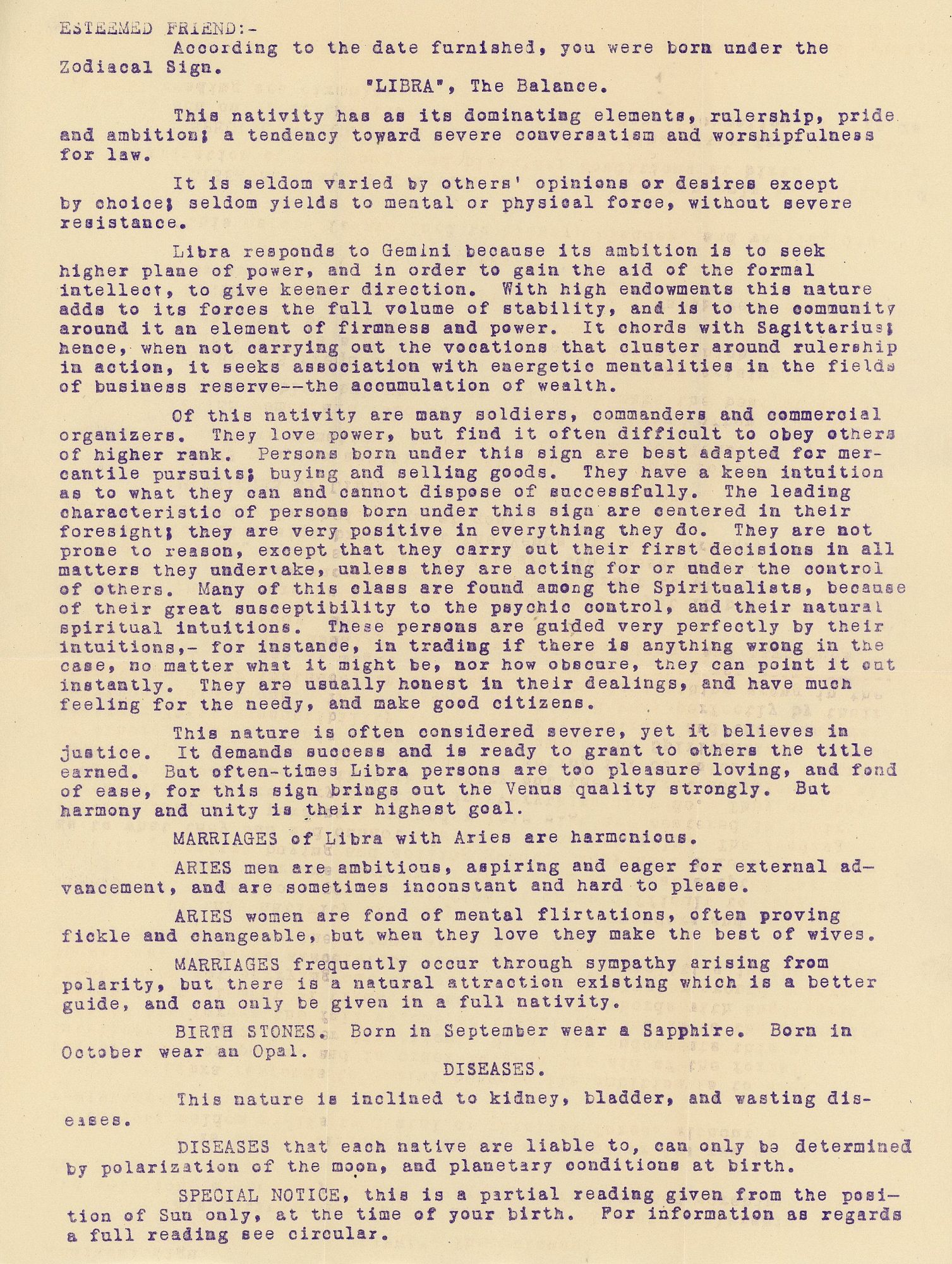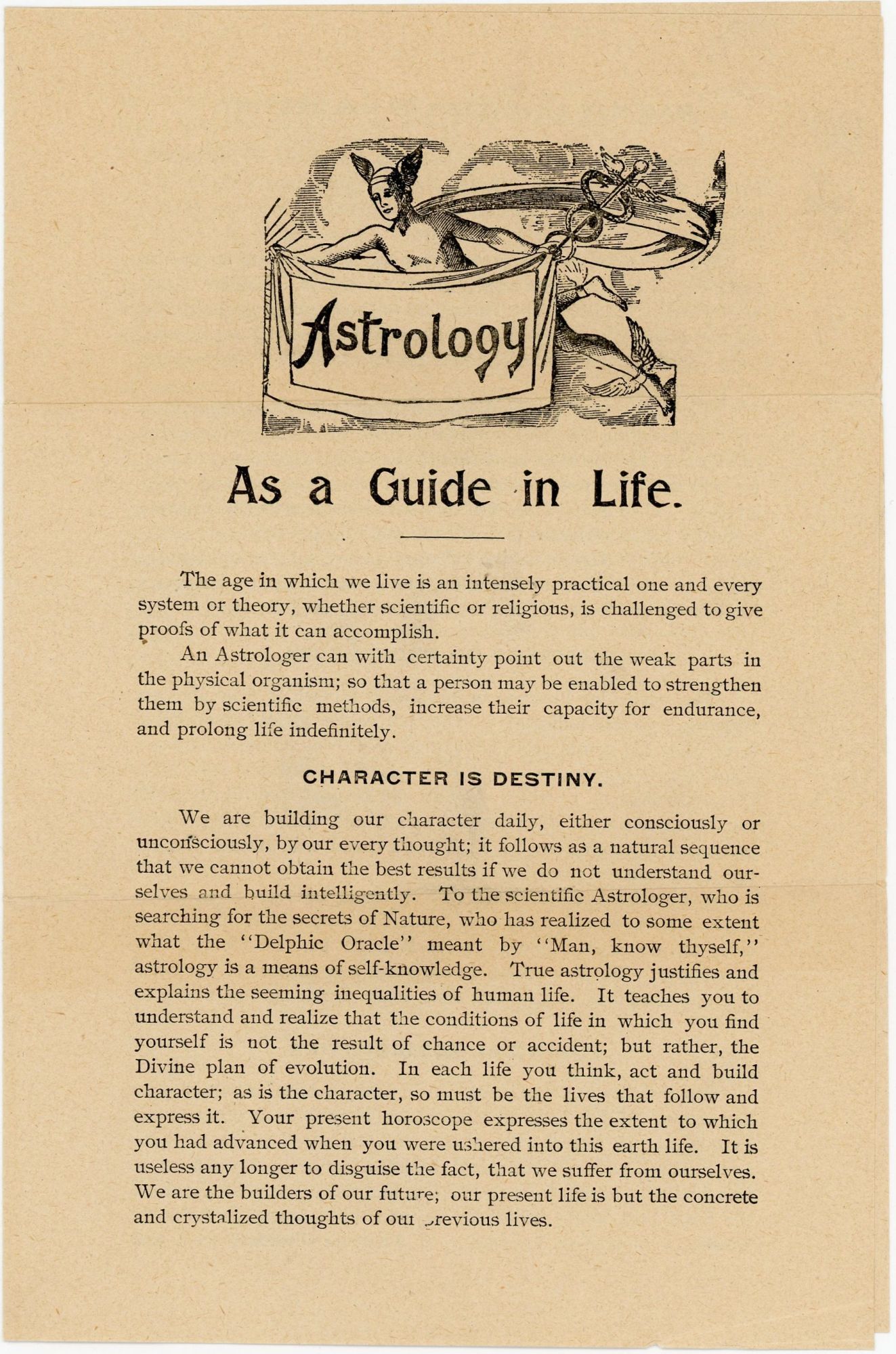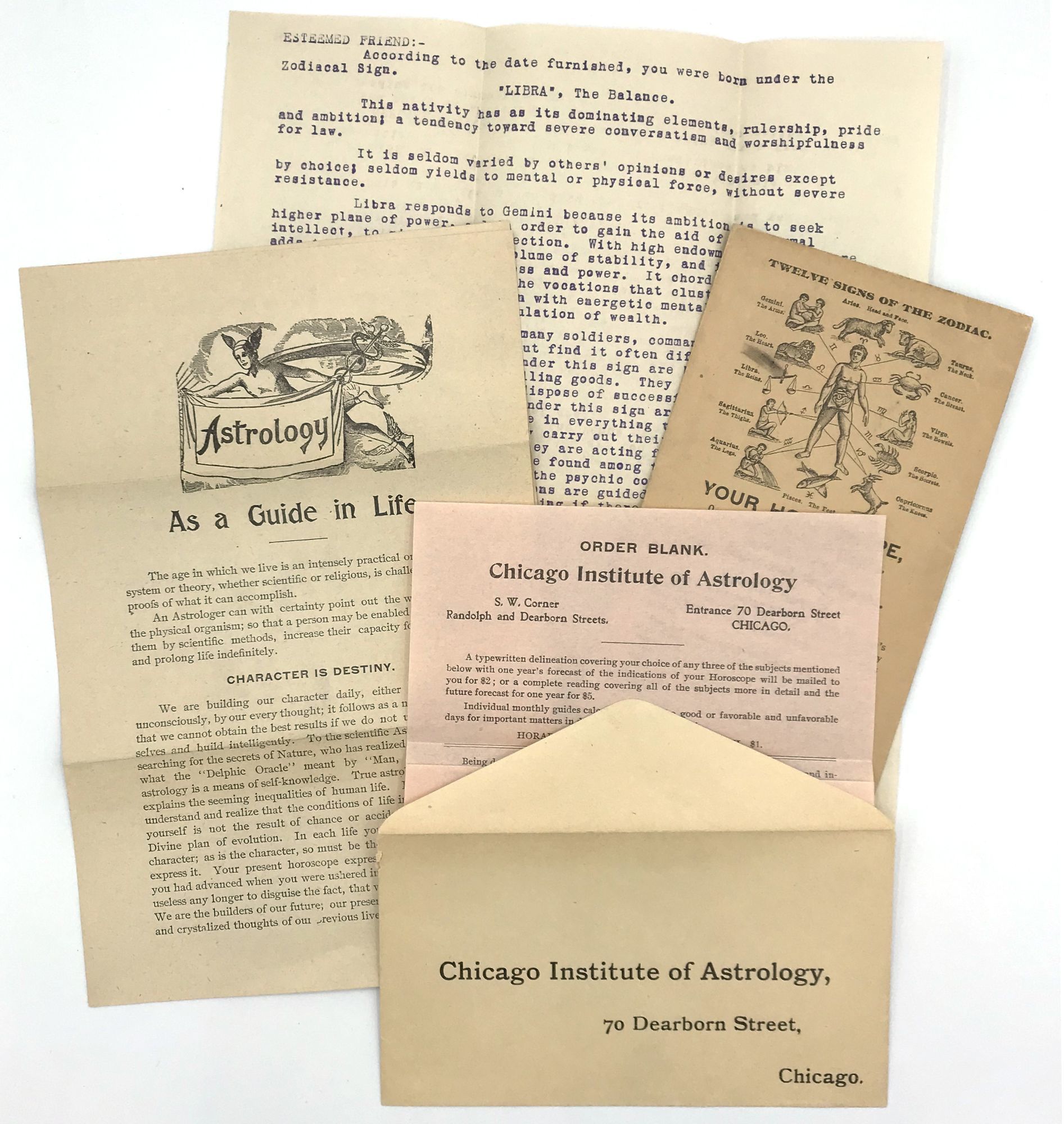 Chicago, Illinois: Chicago Institute of Astrology, 1906. Fine.. Three (3) items relating to the Chicago Institute of Astrology, including: one bifolium (9" by 6") advertising the Institute's mail-order horoscope service; one original typewritten horoscope (11" by 8.5") with original illustrated envelope; and one blank order slip (8.5" by 5.5") with original printed envelope. The bifolium, titled "Astrology as a Guide in Life", details how horoscopes and astrology can elucidate the role of three themes in a person's life: "Business or Profession", "Financial Possibilities", and "Love and Marriage". It concludes with a plug for its mail-order service, which sends customized horoscopes starting at the low price of $2.00. We have sadly been unable to determine who this particular horoscope was meant for, but do know that they were a Libra who was "best adapted for mercantile pursuits" and "inclined to kidney, bladder, and wasting diseases" due to the "polarization of the moon and planetary conditions at birth.