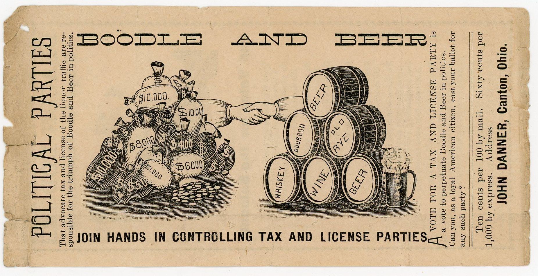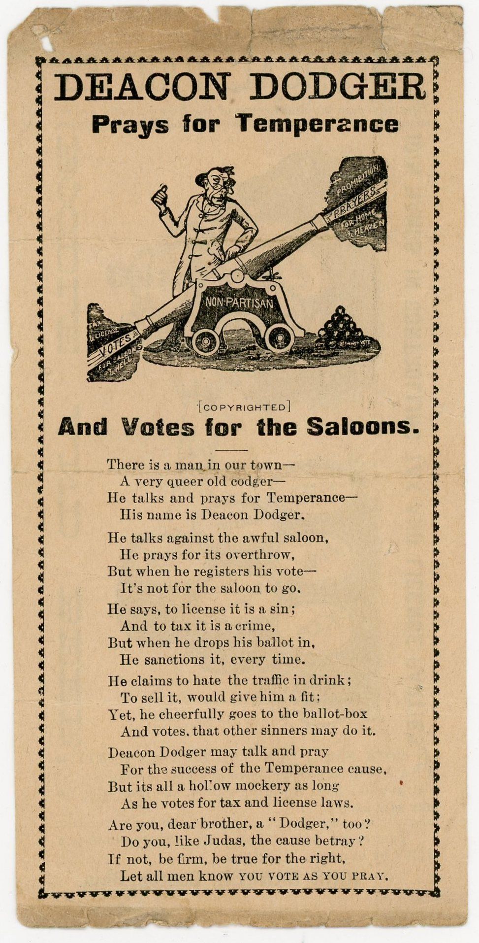 Canton, Ohio: John Danner, 1884. Very good to fine; some marginal dust soiling, short tears, not affecting text or image.. A small pro-Temperance political flyer (6" by 3") published during a turbulent period in Ohio when "Boodle and Beer" were seen as beginning to "triumph" in the political sphere. The flyer asserts that "A vote for a tax and license party is a vote to perpetuate 'Boodle and Beer'" and asks, "Can you, as a loyal American citizen, cast your ballot for any such party?" The verso depicts "Deacon Dodger", a satirical character that prays for temperance but votes for the saloons; underneath is a scathing rhyme decrying his hypocrisy at the polls.