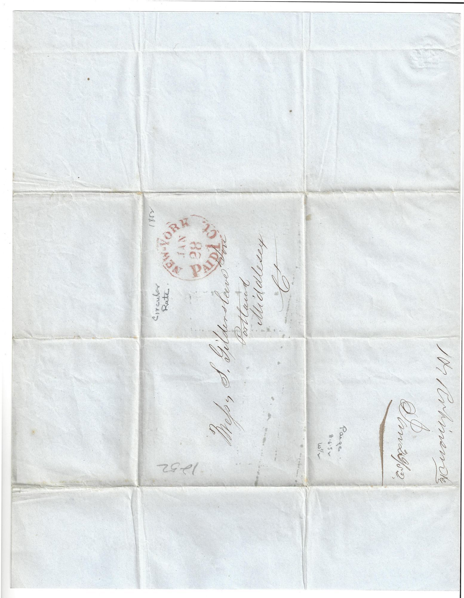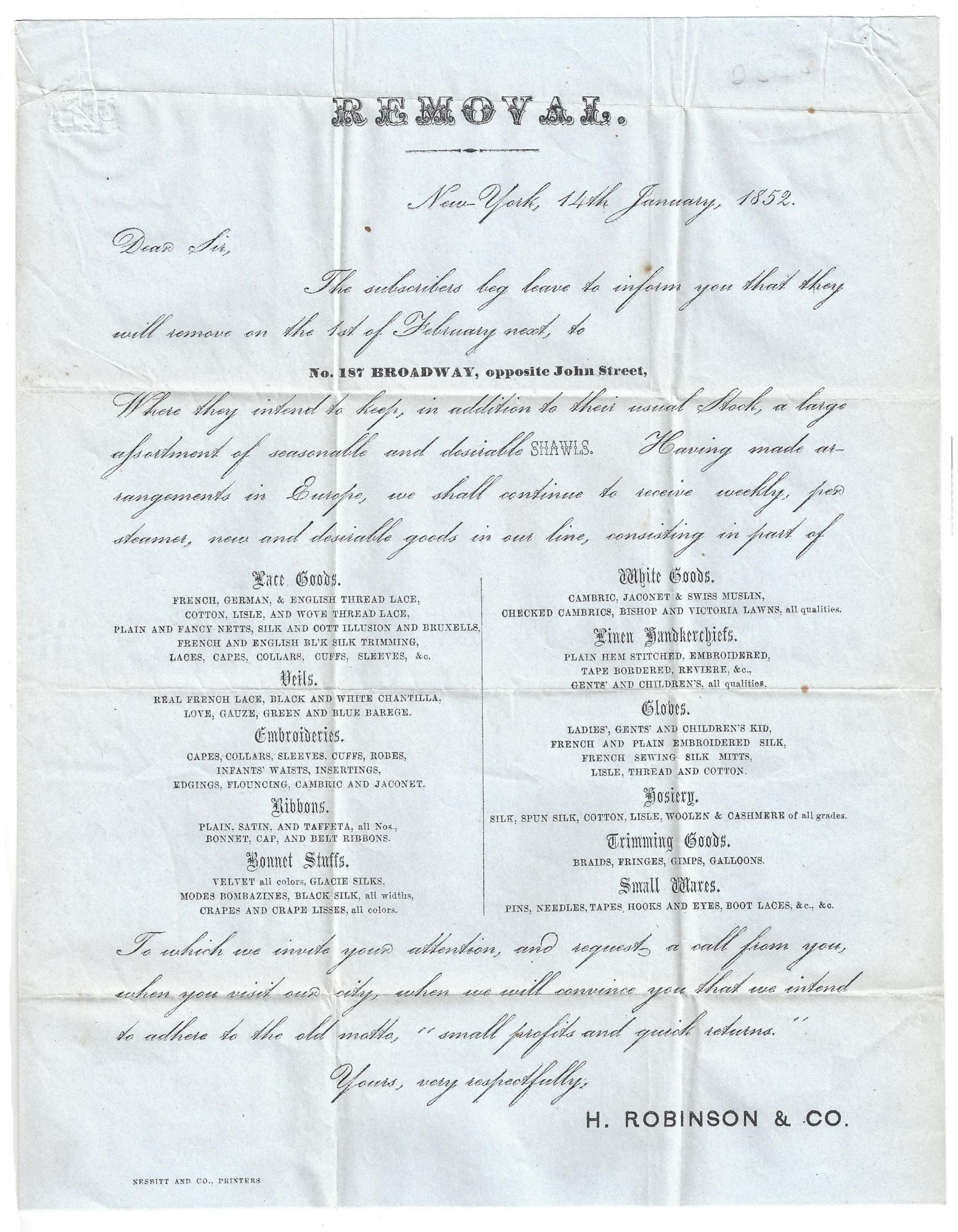 New York: Nesbitt and Co., Printers, 1852. Fine; addressed and postmarked, creased where previously folded.. A circular printed for H. Robinson & Co. advertising the sale of shawls, lace, ribbons, "white goods" (i.e. cambric and muslin), gloves, hosiery, trim, and "small wares" (pins, needles, laces, etc.), all imported by steamer from Europe. Measures 10.75" by 8.25
