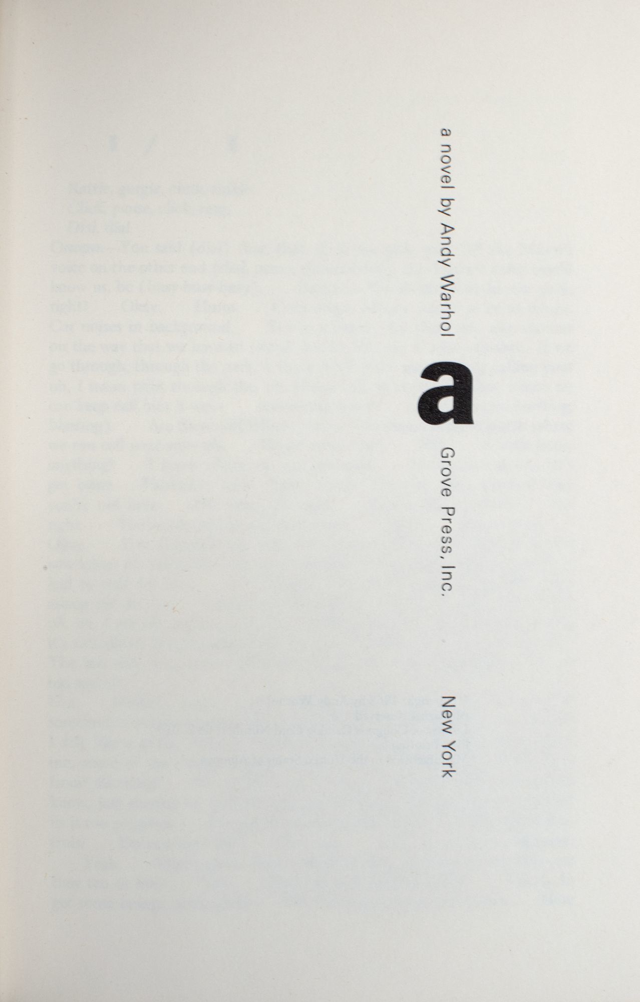 New York: Grove Press, 1968. First edition. 451 pp. 1 vols. 8vo. Black cloth. Fine in fine clipped dj. First edition. 451 pp. 1 vols. 8vo. Twenty-four hours in the life of Warhol superstar, Ondine, as recorded in phone conversations with Warhol. The twenty-four tapes were typed up by Velvet Underground drummer Maureen Tucker and a couple of high schoolers. The editor, factory regular and photographer Billy Name, kept in all of the typos and other errors of transcription in a Warholian gesture of imagism.