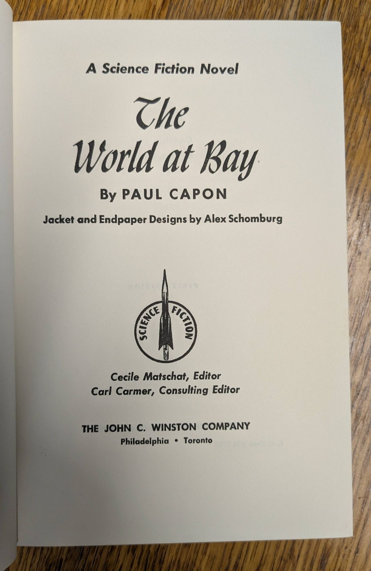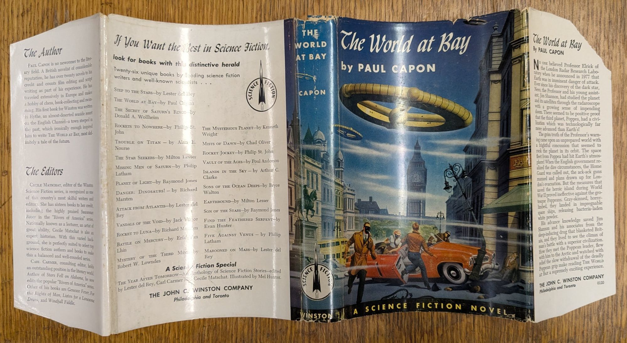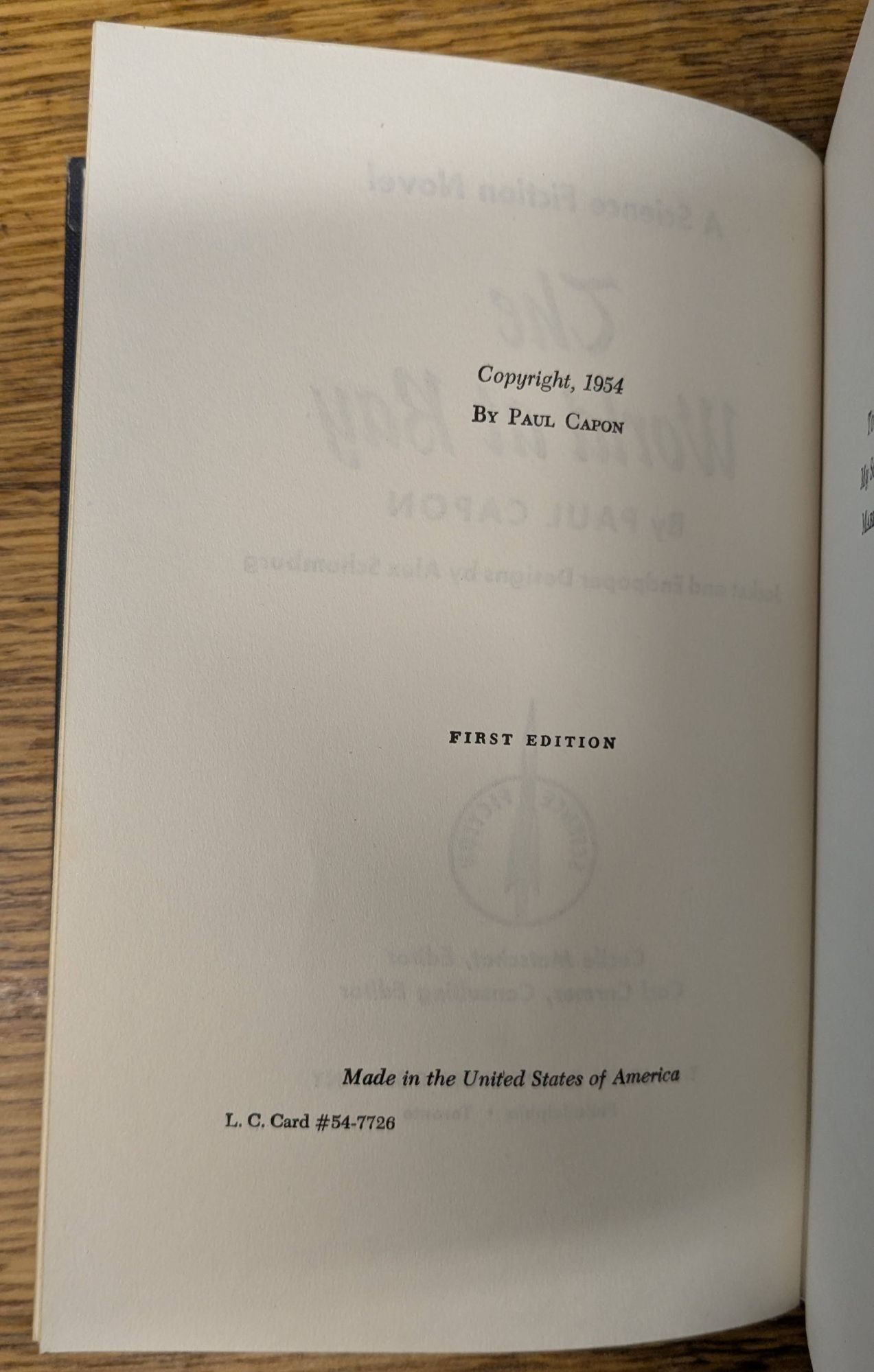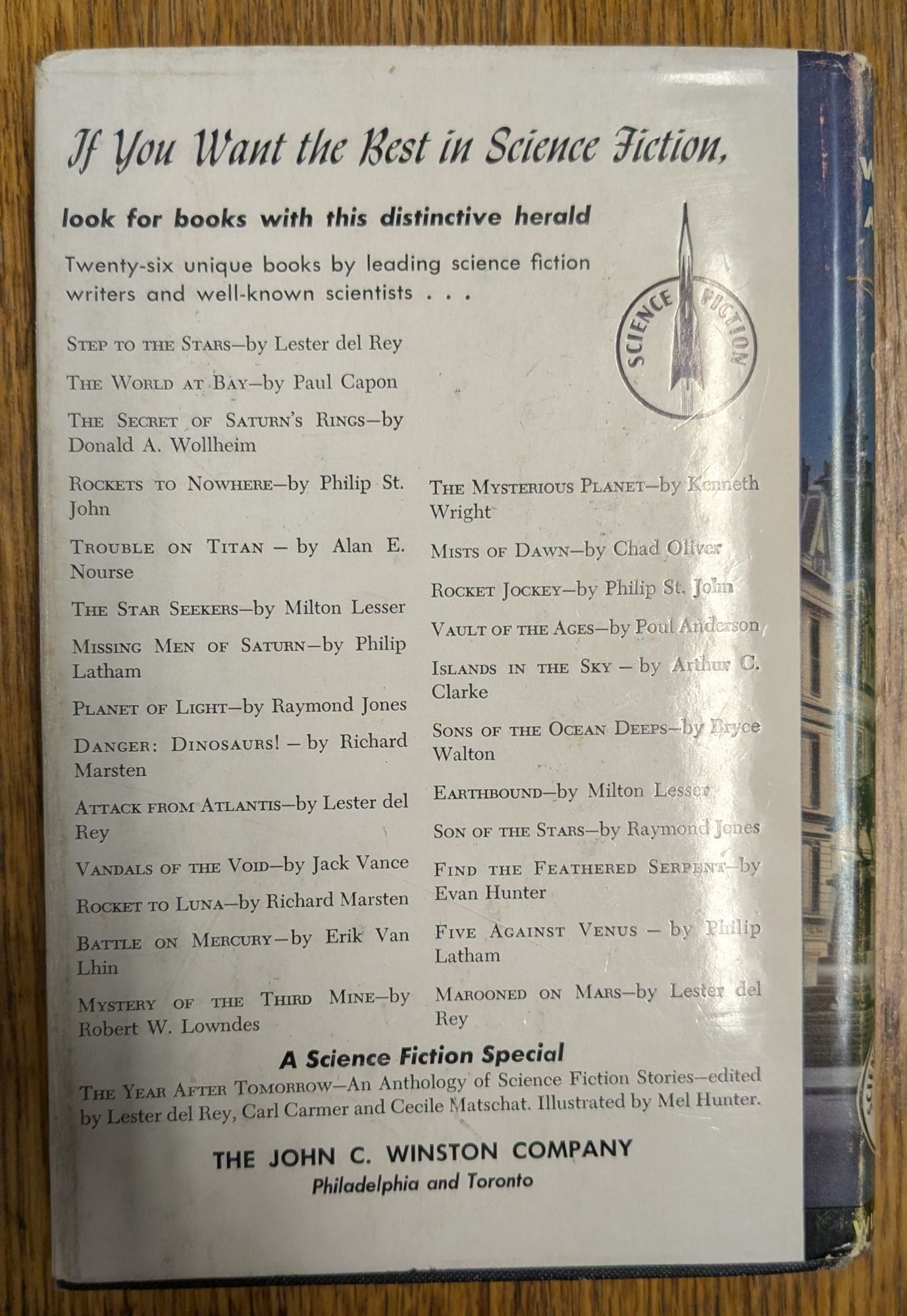 Philadelphia: The John C. Winston Company, 1954. First edition. Hardcover. Very good +/very good +. Alex Schomburg. 208pp. Octavo. [22cm]. Black cloth over boards with the title stamped in red ink on the spine. Illustrated dust jacket and end papers. Spine ends are scuffed. There is some slight discoloration on the end papers near the hinges. Dust jacket has minor tearing on edges and minimal fading on spine. Jacket is price clipped. Part of The John C. Winston Company's Best in Science Fiction series. Dust jacket and end papers illustrated by Alex Schomburg.