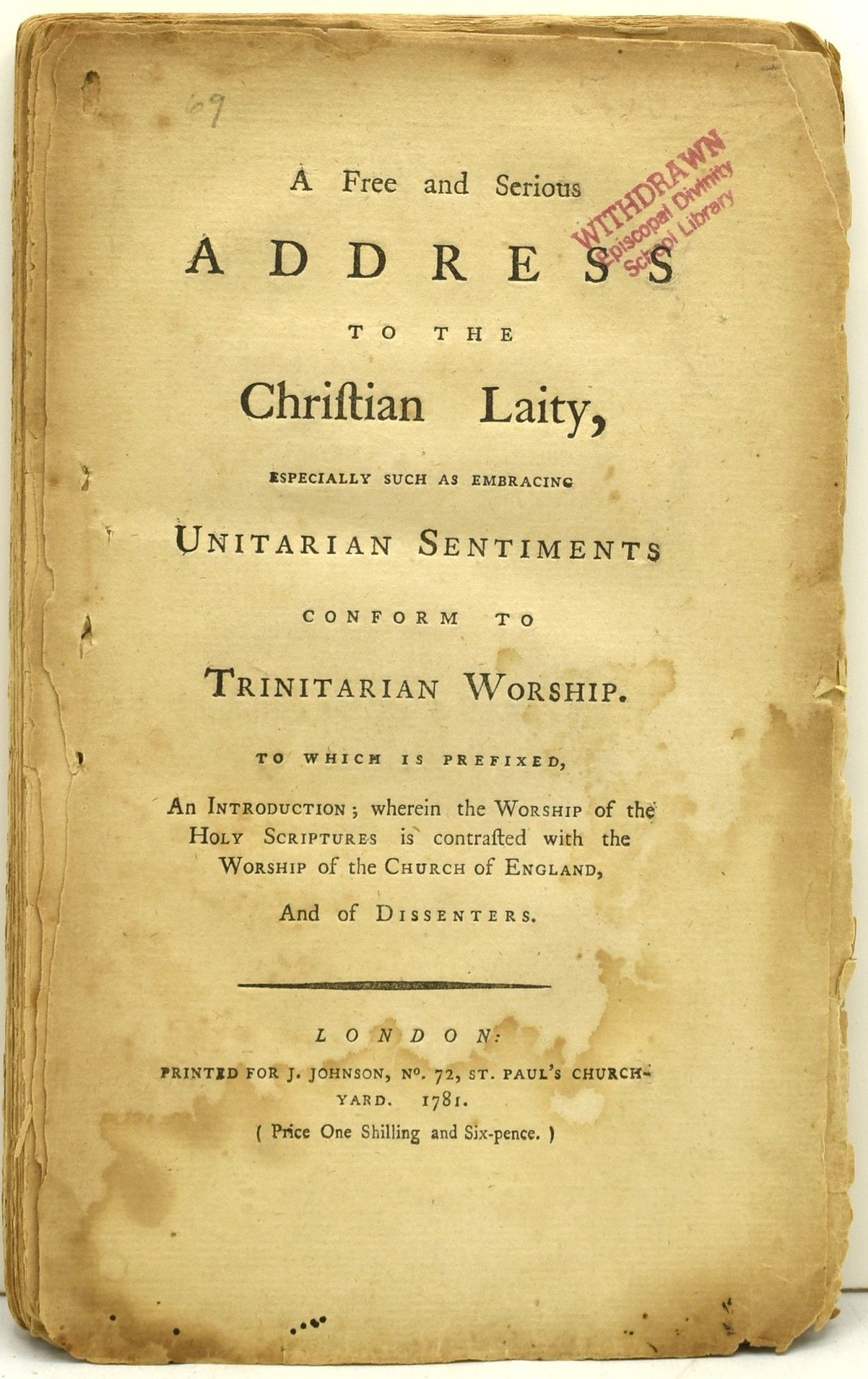 London: J. Johnson, 1781. First Edition. Disbound. Good binding. 8vo., in publisher's sewn wrappers which are now unsewn; 114 pages; the title leaf stamped "WITHDRAWN. Episcopal Divnity School Library."~~The address composed (and written pseudonymously by Joshua Toulmin), who is described in wikipedia as "a serial dissenting minister"; an apt appelation as he as a dissenting minister of Presberitian, Baptist and finally Unitarian congreations. His reputation was that of a religious radical.~~Uncommon in commerce.~. Good binding.