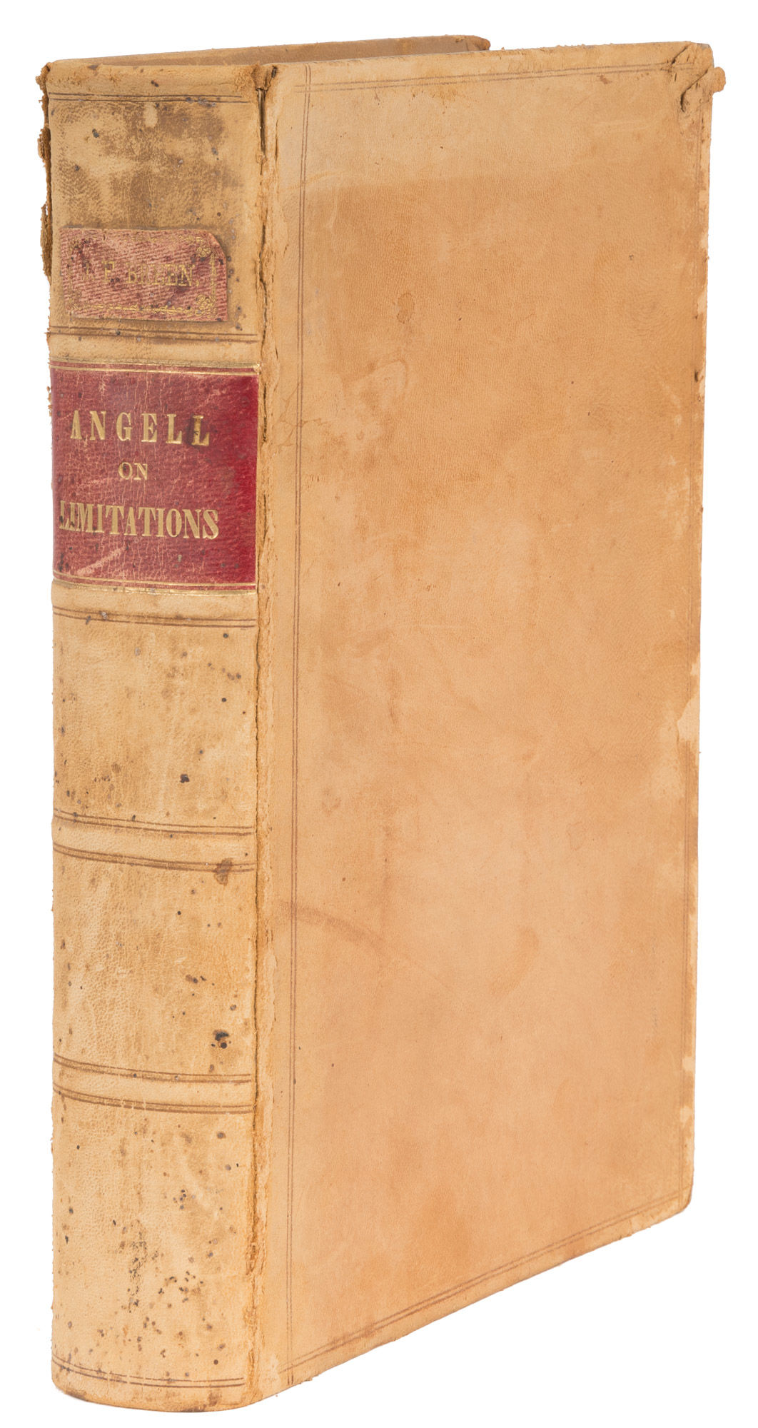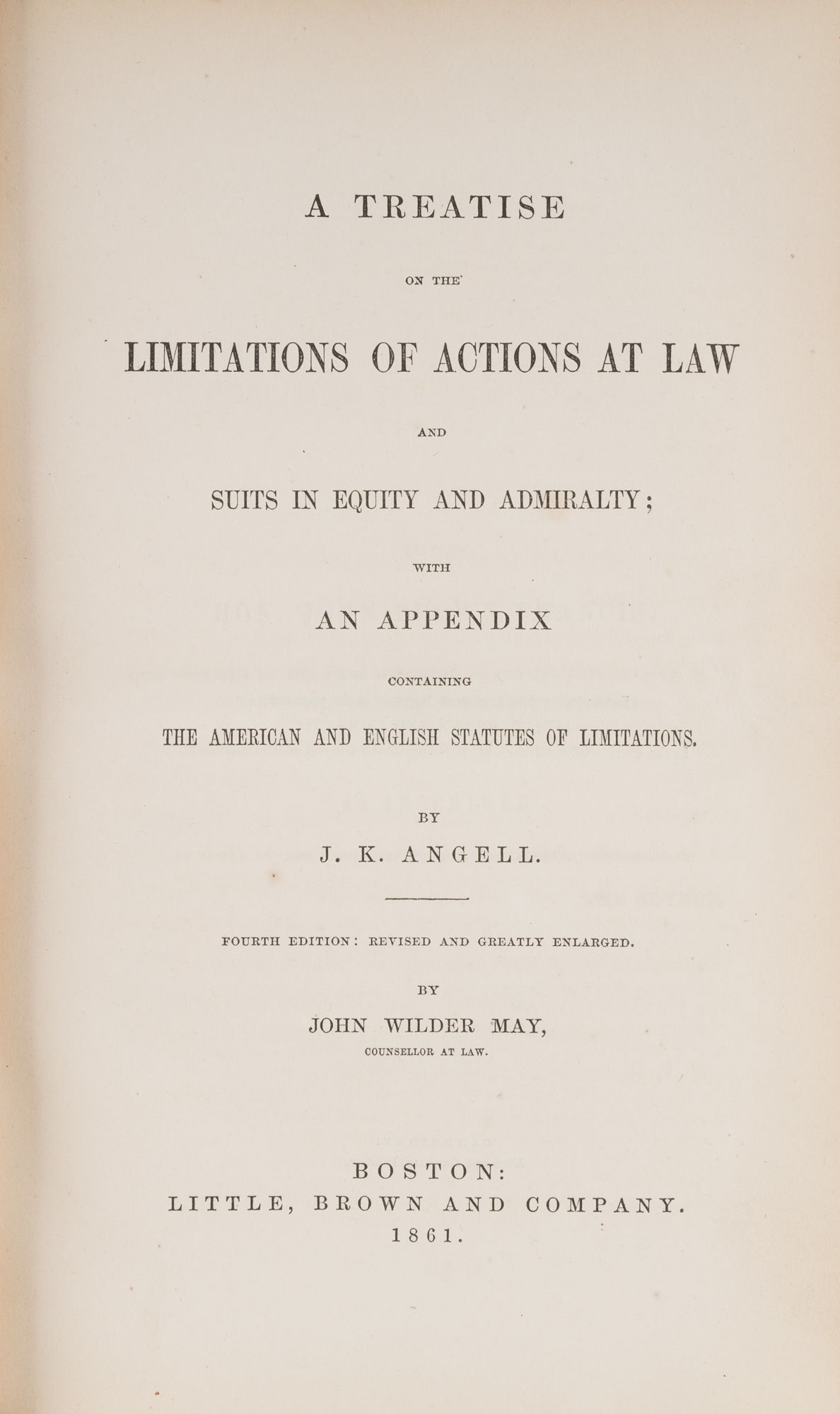 1861. Boston: Little, Brown, and Co., 1861 4th ed.. Boston: Little, Brown, and Co., 1861 4th ed. Angell's Notable Treatise on Limitation of Actions Angell, J[oseph] K. [1794-1857]. May, John Wilder [1819-1883]. A Treatise on the Limitations of Actions at Law and Suits in Equity and Admiralty; With an Appendix Containing the American and English Statutes of Limitations. Revised and Greatly Enlarged. Boston: Little, Brown, and Company, 1861. 8, [2], xliv, 494, [2], cl, 647-667 pp. Publisher's advertisements to first 8 pp. Octavo (9-1/2" x 5-1/2"). Contemporary sheep, blind rules to boards, raised bands, blind fillets, lettering piece and small ownership label (of "J.F. Breen") to spine. A few small scuffs and scratches to boards, light spotting to boards and spine, moderate rubbing to extremities, joints cracked, rear hinge starting slightly at head, corners bumped and somewhat worn, faint offsetting to preliminaries. Moderate toning to interior, occasional light foxing. $250. * Fourth edition. Angell was a Rhode Island legal scholar and prolific writer of treatises on a variety of topics. The first edition of this well-regarded work on actions was published in 1829. May, a Massachusetts lawyer and later Boston Municipal Court judge, began to revise the work with the third edition in 1854, after which at least two editions (including ours) appeared. See Cohen, Bibliography of Early American Law 9072 (citing 3rd ed).