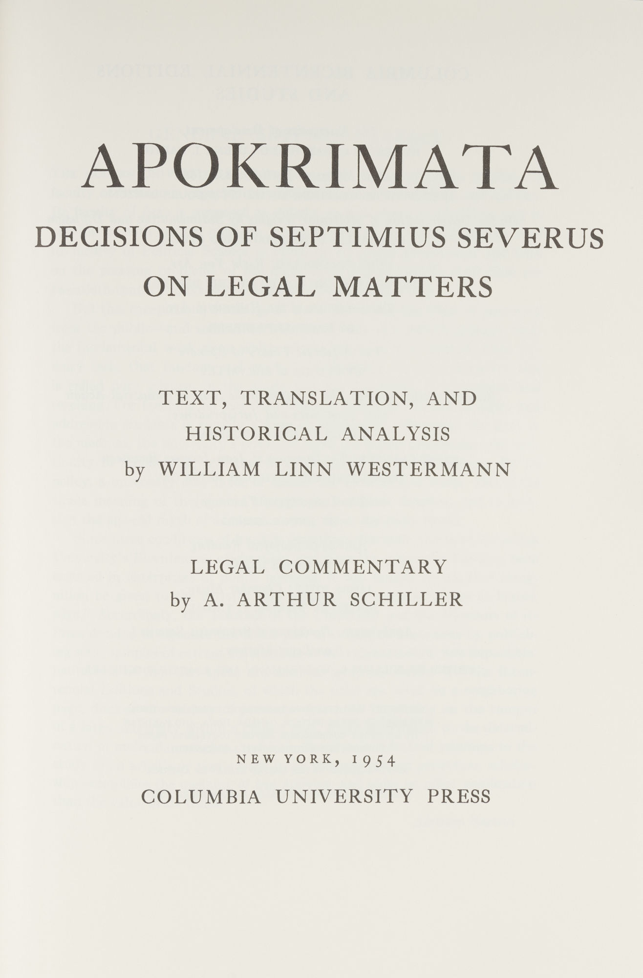 1999. Legal Classics Library. Legal Classics Library. Severus, Lucius Septimius, Emperor of Rome (146-211). Westermann, William Linn (1873-1954). Schiller, A. Arthur (1902-1977). APOKRIMATA. Decisions of Septimius Severus on Legal Matters. Text, Translation, and Historical Analysis. Legal Commentary by A. Arthur Schiller. New York: Columbia University Press, 1954. x, one folding plate, 110 pp. Reprint The Legal Classics Library, 1999. Full blue calf, with gilt stamped spine and covers, all edges gilt. Fine. $45. * English with occasional Greek. Text, translation and historical analysis by Westermann; legal commentary by Schiller. Among the legal problems discussed are the sale of mortgaged property on foreclosure, the guardianship of orphans, the renunciation of an inheritance by a minor, the legal capacity of women, and the order of proceedings when a will was contested as a forgery.