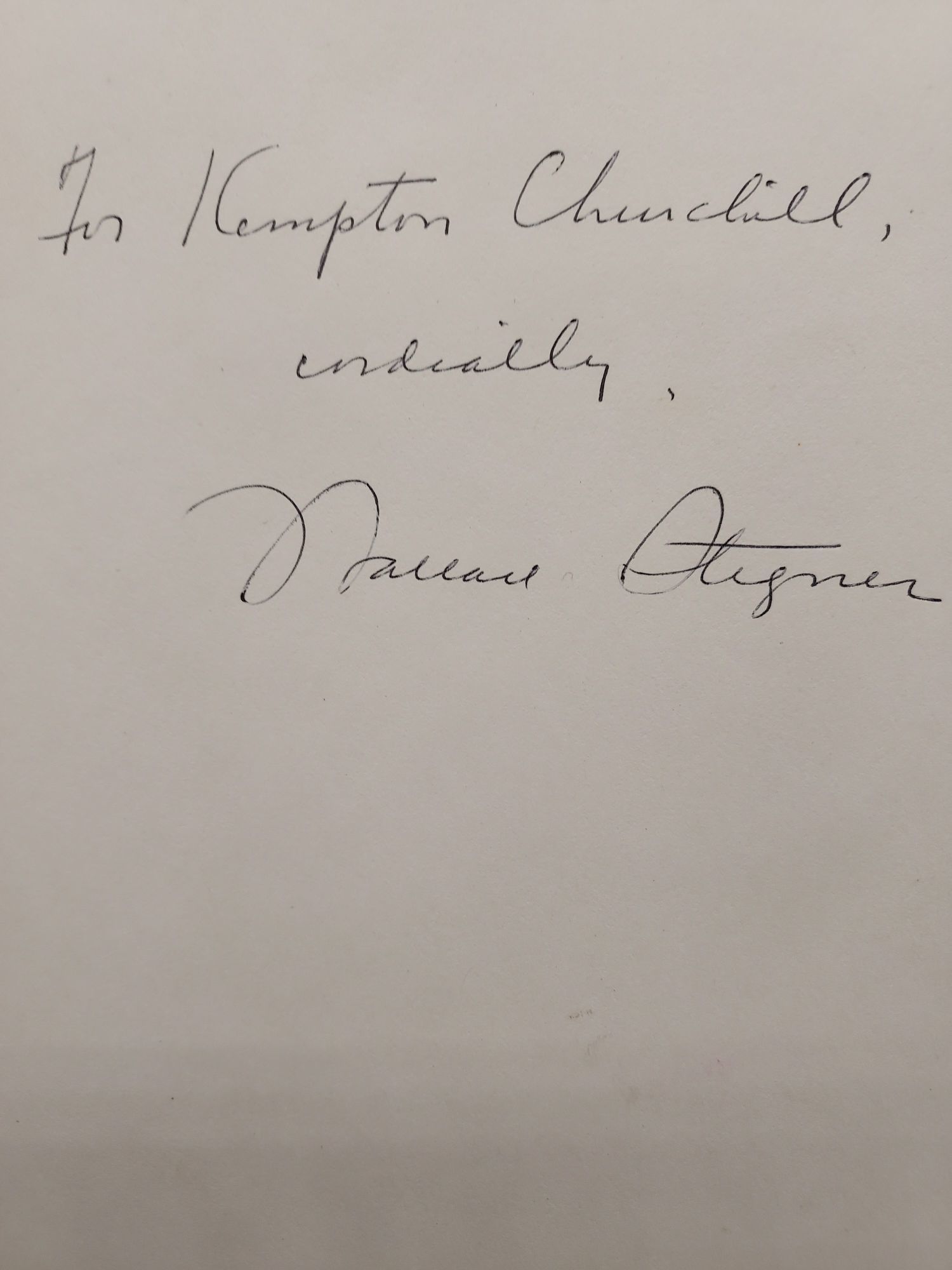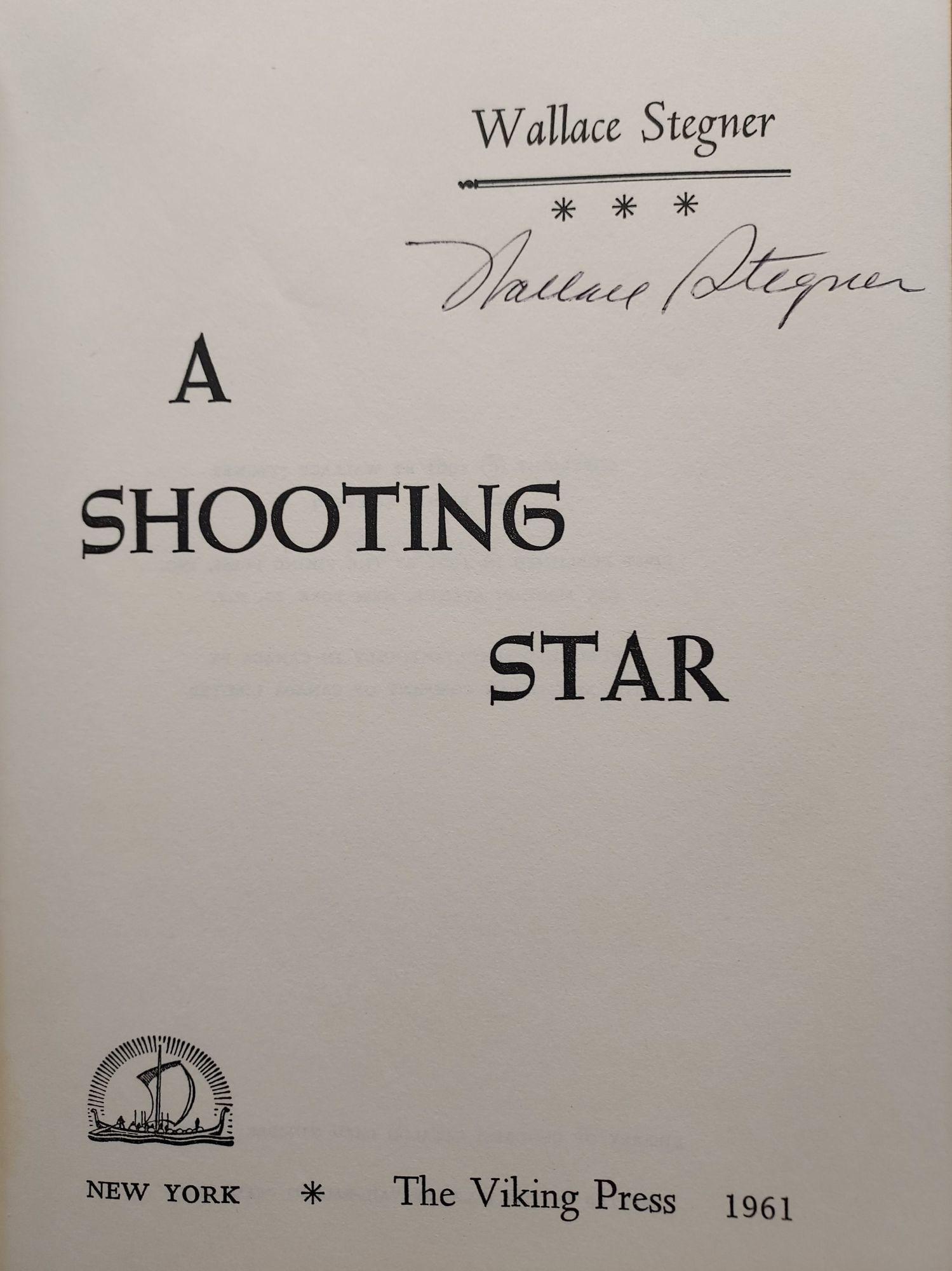 New York: Viking Press, 1961. First edition. Hardcover. Good +/very good. SIGNED. 433pp. Octavo [21.5 cm] 1/4 black cloth with decorative blue paper covered boards, and a gilt stamped title and gilt ruled lines on the spine. Publisher's blue top stain. The spine is rolled. The inside margins of the preliminary pages are a bit discolored. In a dust jacket, with toning to the rear panel, light rubbing and chipping to the edges, and an open tear to the bottom of the spine that measures approx' 1 inch wide by 1 inch deep. Originally titled "Sabrina." The story follows the infidelity and moral disintegration of an "independent woman of the twentieth century." Colberg #A15.1.a. This copy is signed by Wallace Stegner on the title page, and is additionally inscribed by Stegner on the front free endpaper.