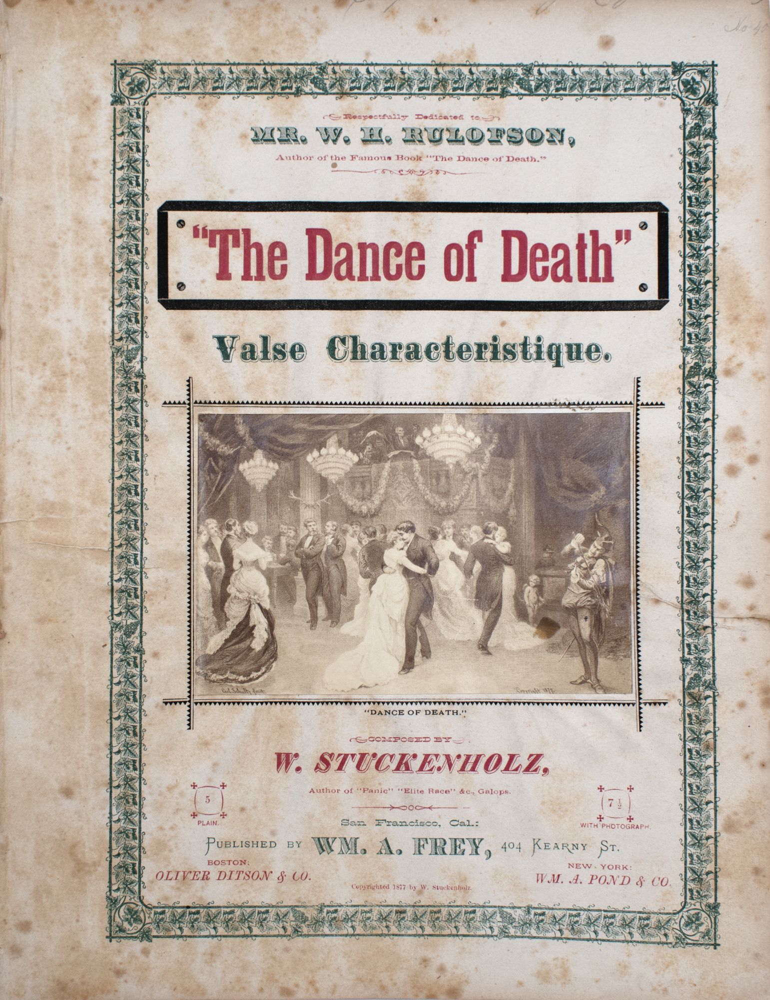 San Francisco, CA: Published by Wm. A Frey, 1877. First edition, sheet music. 8pp. Large 4to. Pictorial wrappers (with original photograph affixed to front cover) printed green, red and blue, with decorated double-rule border, VG, with some wear. The spine is notched (where once bound), front cover is quite foxed, but albumen print photograph is fresh and clean. A very good copy of a scarce publication. First edition, sheet music. 8pp. Large 4to. "The Dance of Death: Valse Characteristique" is a musical score, composed by W. Stuckenholz, written in response to the notoriety of the book The Dance of Death, a work published earlier in 1877, in San Francisco, under the pseudonym "William Hermann." The Dance of Death has long been attributed to Ambrose Bierce and Thomas A. Harcourt, who (according to legend) wrote the work for the photographer W. H. Rulofson, whose wife had become enchanted by the salacious movements of the waltz. This score is dedicated to photographer W. H. Rulofson; printed above the title, on the front cover of the sheet music, is the dedication (as issued): "Respectfully Dedicated to/ Mr. W. H. Rulofson,/ Author of the Famous Book 'The Dance of Death'." Affixed to the front cover (as issued) is an original albumen print photograph, measuring 3 3/4 by 5 3/4 inches, which reproduces a painting; the painting depicts an elaborate Victorian ballroom filled with formally dressed couples who are dancing, and in the fore-ground is a male figure (possibly the devil) playing the violin. California State Library has a copy of this composition, also published in 1877, but it has an entirely different cover design, which does not have the photographic image, nor is it dedicated to W. H. Rulofson; Not in Levy Collection at JHU