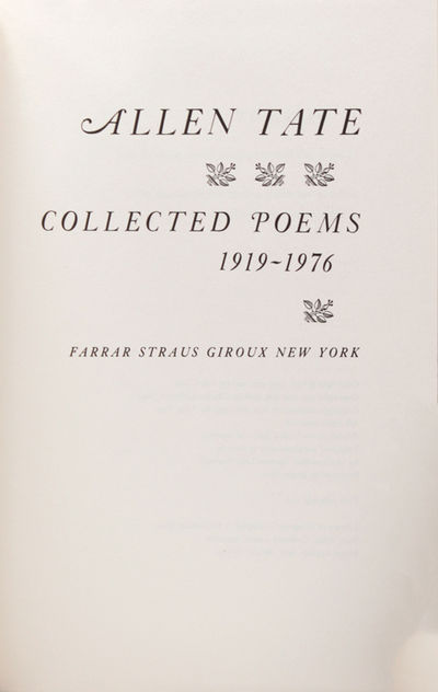 New York: Farrar Straus Giroux, 1977. First edition. 8vo. Rear cover is slightly bumped at tip of one corner, else a fine copy in fine dust jacket. First edition. 8vo. Inscribed and signed by Allen Tate: "With many thanks/ to Mary and Jim with affection/ Allen/ February 6, 1978" (on front flyleaf).