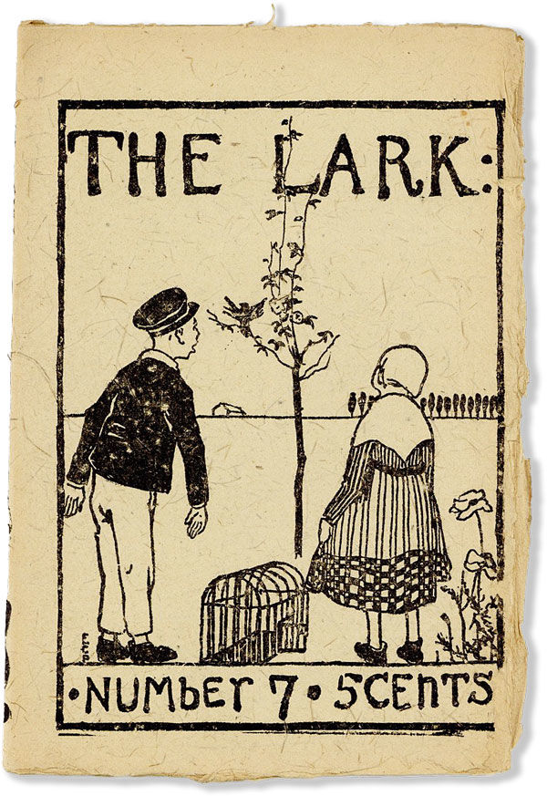 Single issue of perhaps the most whimsical and iconoclastic of the "little magazines" that appeared in the 1890s, with contributions from Ernest Peixotto, Edmond Charlroy, and Clinton Brooks Burgess. The Lark was dedicated to "sincerity, spontaneity, and gaiety," and featured nonsense verse and illustrations printed on thin (and frequently brittle) bamboo paper, with a deliberately informal aesthetic (Chielens, American Literary Magazines 208-9). With contributions from "fin-de-siecle San Francisco's most promising writers and artists," it helped to establish the city as "the literary center of the Pacific Coast" (209, 212). More commonly found in the bound two-volume issue.