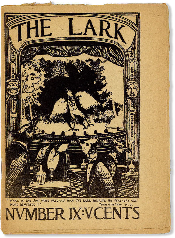 Single issue of perhaps the most whimsical and iconoclastic of the "little magazines" that appeared in the 1890s. The Lark was dedicated to "sincerity, spontaneity, and gaiety," and featured nonsense verse and illustrations printed on thin (and frequently brittle) bamboo paper, with a deliberately informal aesthetic (Chielens, American Literary Magazines 208-9). With contributions from "fin-de-siecle San Francisco's most promising writers and artists," it helped to establish the city as "the literary center of the Pacific Coast" (209, 212). More commonly found in the bound two-volume issue.