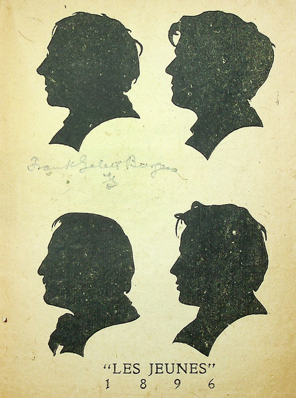 San Francisco: William Doxey, 1896. First Edition. First printing. Octavo (19.5cm). Stapled pamphlet on tan bamboo paper, printed in black on one side of sheets; 16pp; 3 plates plus cover illustration. With silhouette portraits of "Les Jeunes," the nickname for the main contributors, with Frank Gelett Burgess' signature in pencil beneath his portrait. Lightly toned, partly unopened: Near Fine.
