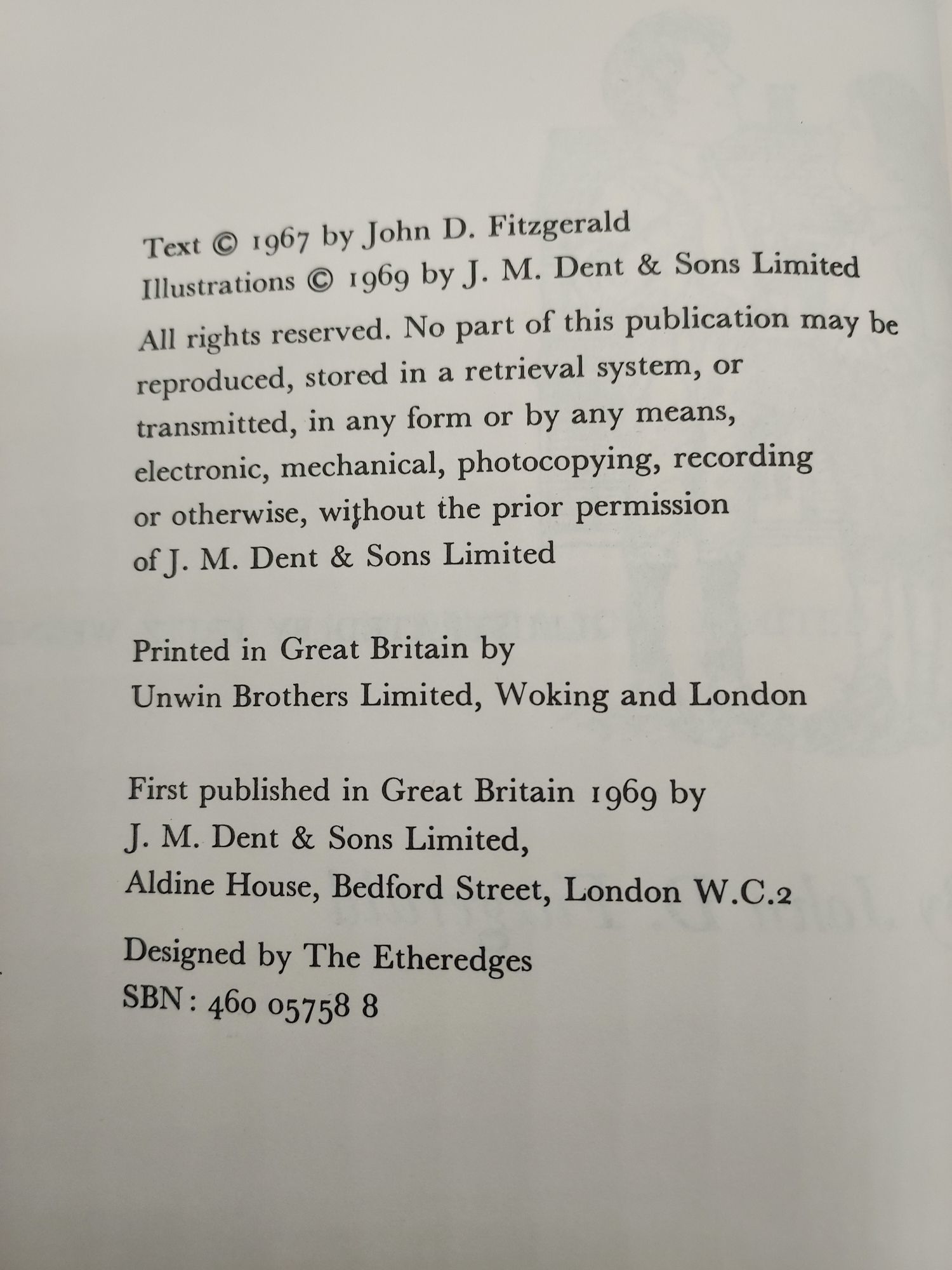 London: J. M. Dent & Sons Limited, 1969. First UK edition. Hardcover. Very good/very good. Fritz Wegner. 175pp. Octavo [22 cm] Red paper over boards. The boards show minor edge wear, and the spine is a trifle slanted. There is light foxing to the top and fore-edge of the text block. In a very attractive dust jacket, with the front flap lower corner clipped, however the price still intact. The edges are moderately rubbed and soiled, and the rear panel is lightly soiled. The first title in Utah-born John D. Fitzgerald's hugely popular series.