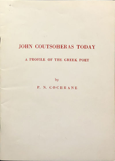 Sydney: [P.N. Cochrane], [n.d.]. First Edition. Paperback. Fine. About Fine. Wraps toned. Square and firmly bound with two staples, clean internally. A small twenty-three page pamphlet about the writing and biography of the award-winning Greek poet.