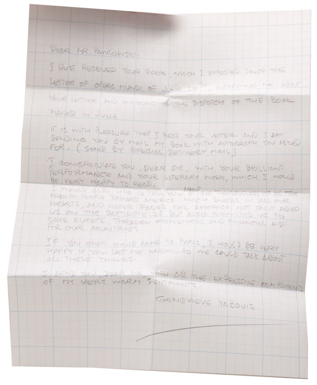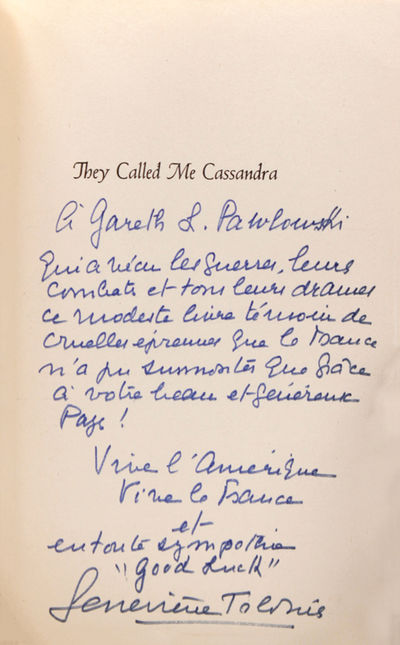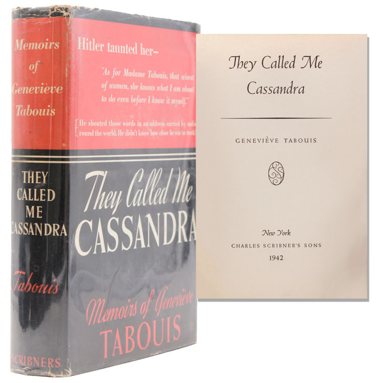 New York: Charles Scribner's Sons, 1942. First American edition. Frontispiece. 436pp. 8vo. Red cloth. A very good copy in very good clipped dust jacket; jacket has moderate wear, and light creasing, at tips of spine, rubbed at extremities of front and rear panel, else quite bright. First American edition. Frontispiece. 436pp. 8vo. Inscribed, and signed, by Genevieve Tabouis, ten lines in French, concluding with "... Vive l'Amerique, Vive le France... Genevieve Tabouis" (on the half-title page). Laid into the book is an autograph letter signed by Tabouis, to Gareth L. Pawlowski, and the author's business card, also signed by her. The long, typed letter (in French), one octavo page (twenty lines, in five paragraphs), on Genvieve Tabouis' engraved letterhead, Paris, "Le 2 Aout 1971," has fine content. The warmly written letter, agreeing to sign her book, also wants to let the American recipient know, "... Je veux vous dire aussi combien la reconnaissance de tous les Francais pour l'Amerique demeure en nos coeurs a tous, et ne s'eteindra jamais, car l'Amerique nous a non seulement aidee sur les champs de bataile, mais encore elle nous a permis de sauver l'Europe en suavant economique et financierement notre Pays..." ("I would also like to tell you about the thankfulness of all the French people towards America which dwells in all of our hearts, and never fades, for America not only aided us on the battlefields but also permitted us to save Europe through economic and financial aid for our country..."). A moving letter, in memory of American assistance to France during the Second World War. The letter is boldly signed by Genevieve Tabouis (it is in fine condition, folded, in original mailing envelope, , and laid into the book).