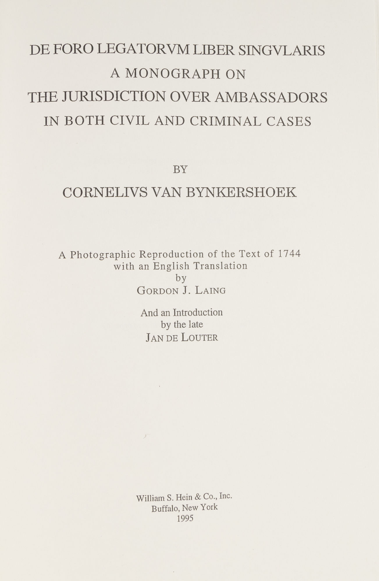 1995. Bynkershoek, Cornelis van. De Foro Legatorum Liber Singularis: A Monograph on the Jurisdiction Over Ambassadors in Both Civil and Criminal Cases. Introduction by Jan de Louter. Translated by Gordon J. Laing. Oxford: Clarendon Press, 1946. Reprint. Buffalo: William S. Hein & Co., 1995. ISBN 0899419488. xxx, 134, 24 pp. Cloth. Fine. $85. * A title in the Carnegie Classics of International Law series. Henry Wheaton says classic treatise on the legal status of diplomats in both civil and criminal matters, is "the great Canon of this branch of international law.