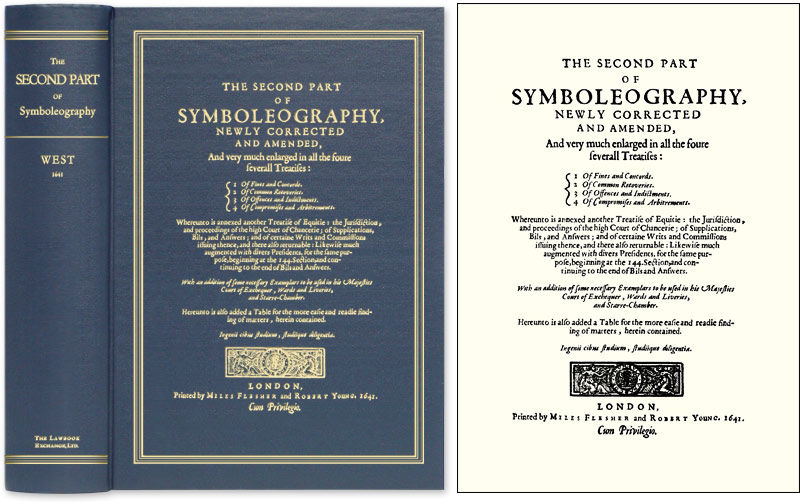 2008. ISBN-13: 9781584778745; ISBN-10: 1584778741. "The Art, or Description, of Instruments and Presidents" West, William. The Second Part of Symboleography, Newly Corrected and Amended, and Verie Much Enlarged in All the Foure Severall Treatises. 1 Of Fines and Concords. 2 Of Common Recoveries. 3 Of Offences and Indictments. 4 Of Compromises and Arbitrements. Whereunto is Annexed Another Treatise of Equitie: The Jurisdiction, and Proceedings of the High Court of Chancerie; of Supplications, Bils, and Answeres; and of Certaine Writs and Commissions Issuing Thence, and There Also Returnable: Likewise Much Augmented with Divers Presidents, for the Same Purpose, Beginning at the 144. Section, and Continuing to the End of Bils and Answers. With an Addition of Some Necessarie Examplars to be Used in His Majesties Court of Exchequer, Wards and Liveries, and Starre-Chamber. Hereunto is Also Added a Table for the More Easie and Readie Finding of Matters, Herein Contained. Originally published: London: Printed by Miles Flesher and Robert Young, 1641. [722 pp.] Reprinted 2008 by The Lawbook Exchange, Ltd. ISBN-13: 9781584778745. 1SBN-10: 1584778741. Hardcover. New. $95. * This second part follows The First Part of Symbolographie. With forms. One of the earliest English texts that addresses conveyancing, it was first published in 1590 and 1594. It is a general practical treatise on English law under its several divisions, and was held in great esteem at the time. The demand for it was so great that West immediately began to prepare a second edition, practically rewriting the whole book." Marvin adds: "West's Symboleography has always been esteemed a book of authority...and contains not only precedents in conveyancing, but of indictments, and of proceedings in chancery.": Legal Bibliography 726.