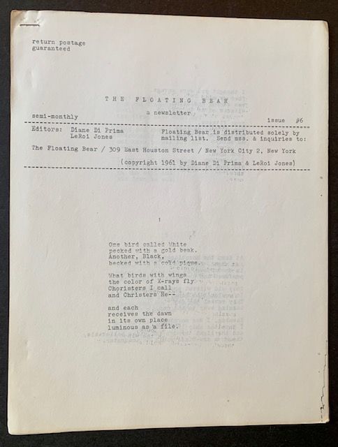 New York: Floating Bear, 1961. Original wraps. Very Good +. The 1961 issue #6 of "The Floating Bear", Diane Di Prima's and LeRoi Jones's first-rate poetry newsletter and mimeo issued out of New York's Lower East Side (at 309 East Houston Street). Crisp and VG+ to Near Fine in its stapled wrappers. Contributors to this issue include Robert Creeley and LeRoi Jones.
