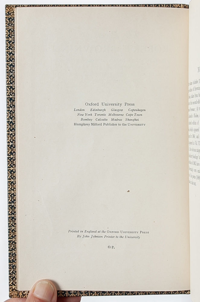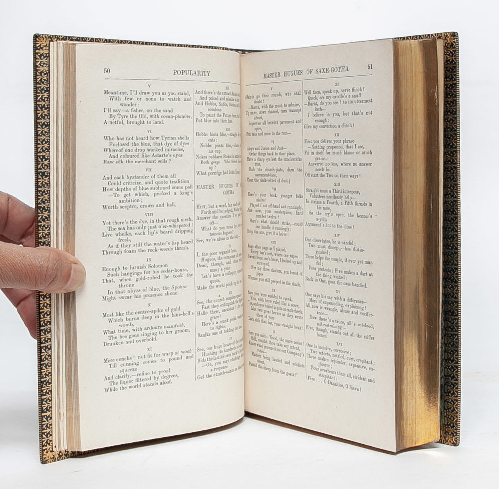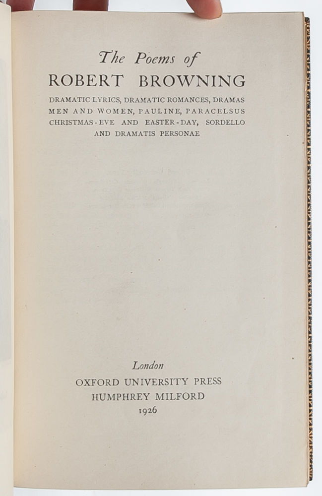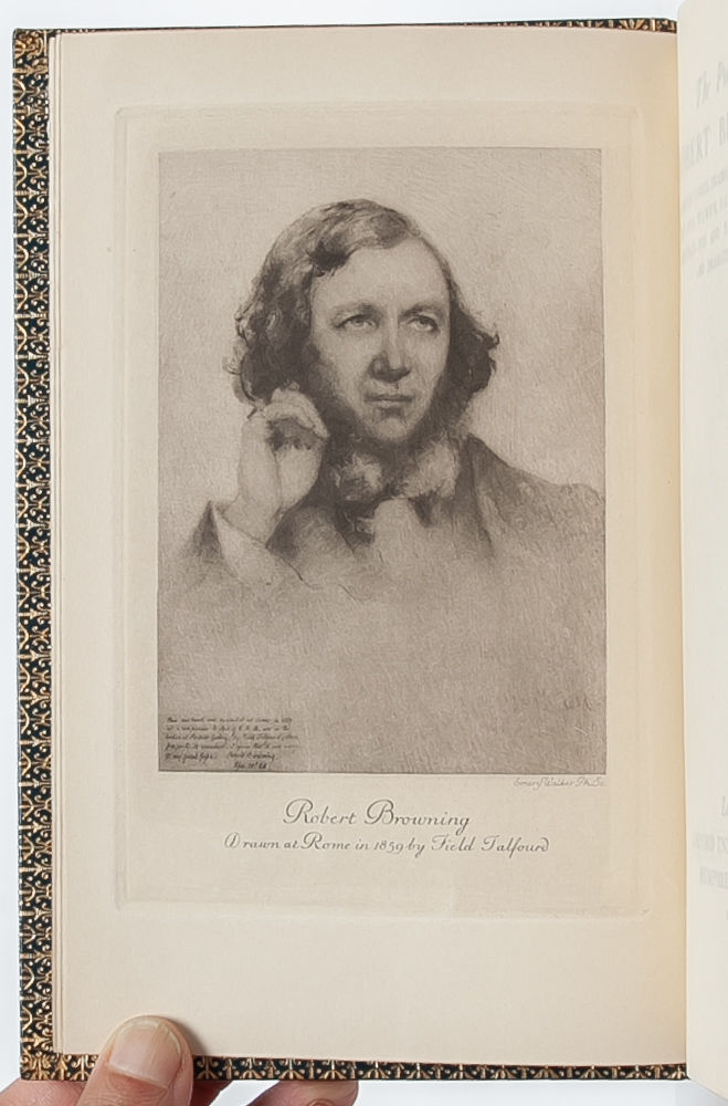 London: Oxford University Press, 1926. Later Edition. Finely bound by Riviere & Son in navy morocco inlaid with royal blue morocco and ornately stamped in gilt to spine and boards. All edges brightly gilt. Inner dentelles gilt. Marbled endpapers. Internally clean and unmarked. Measuring 190 x 125mm. A beautiful example of Browning's most important works.