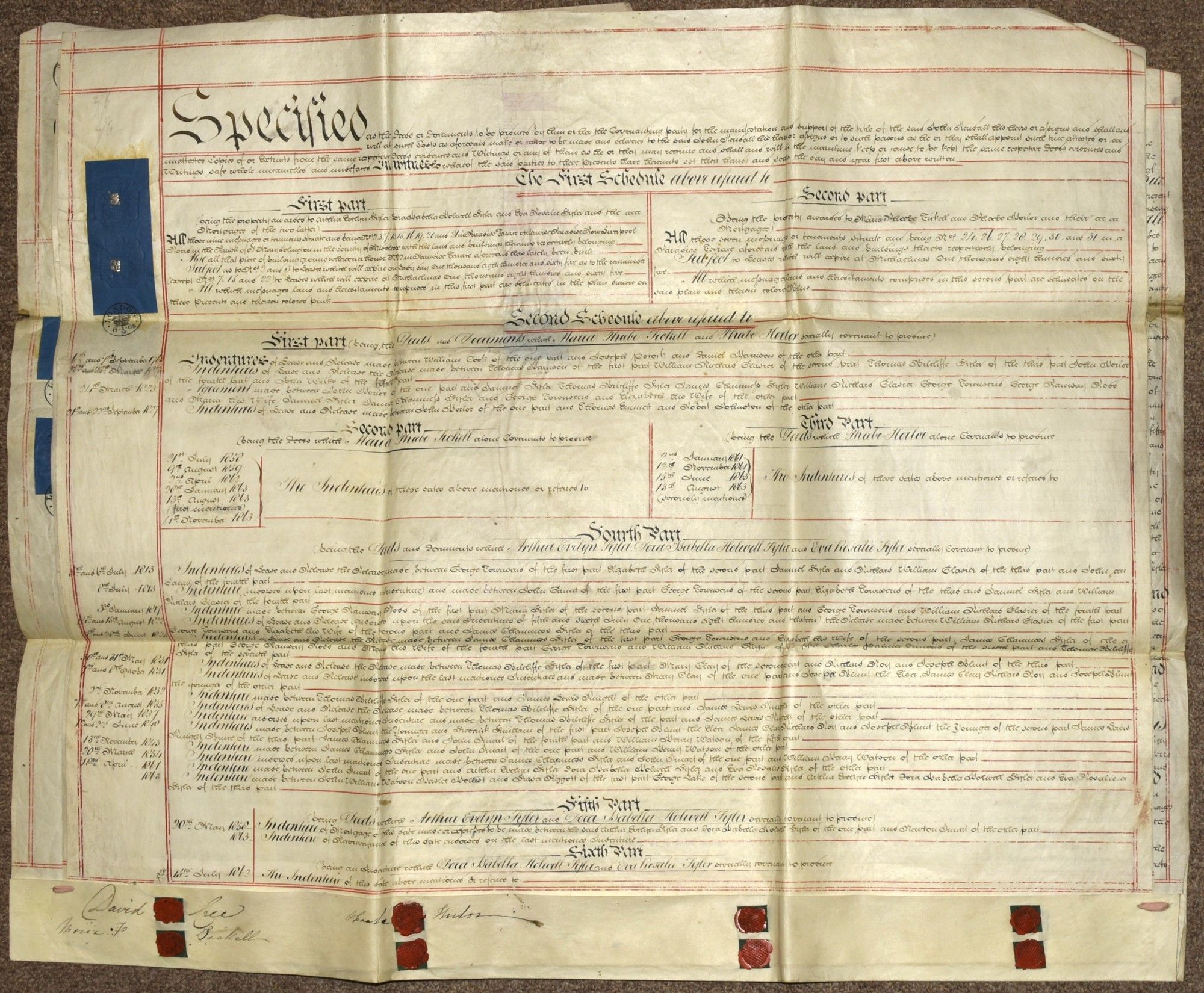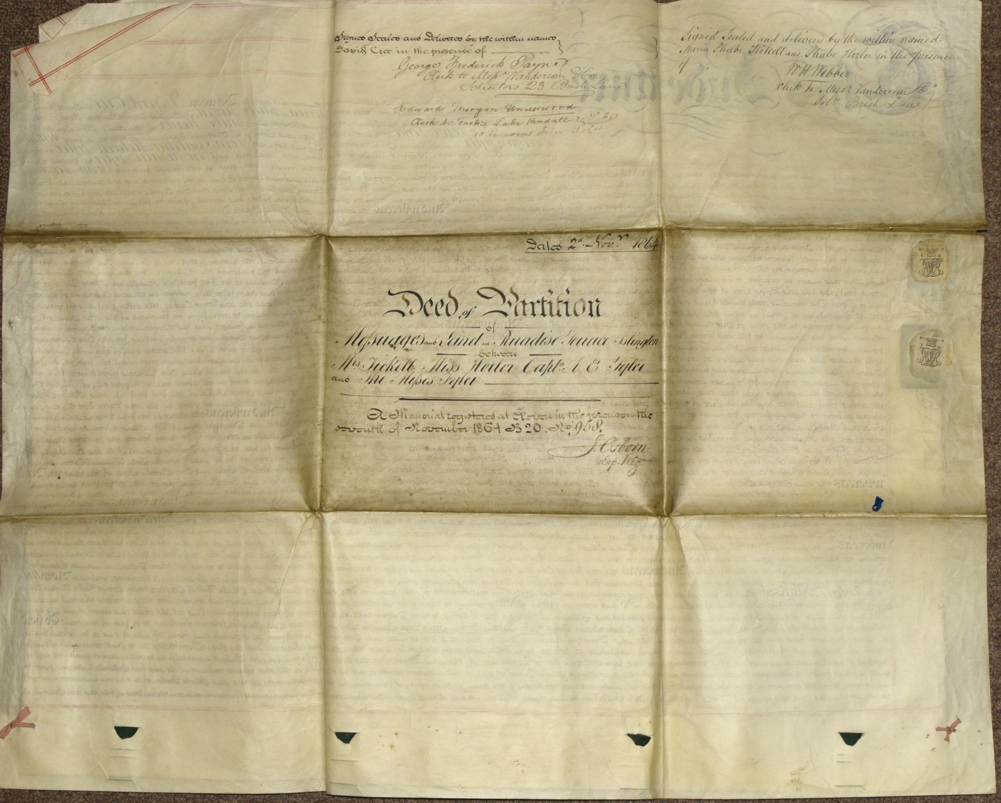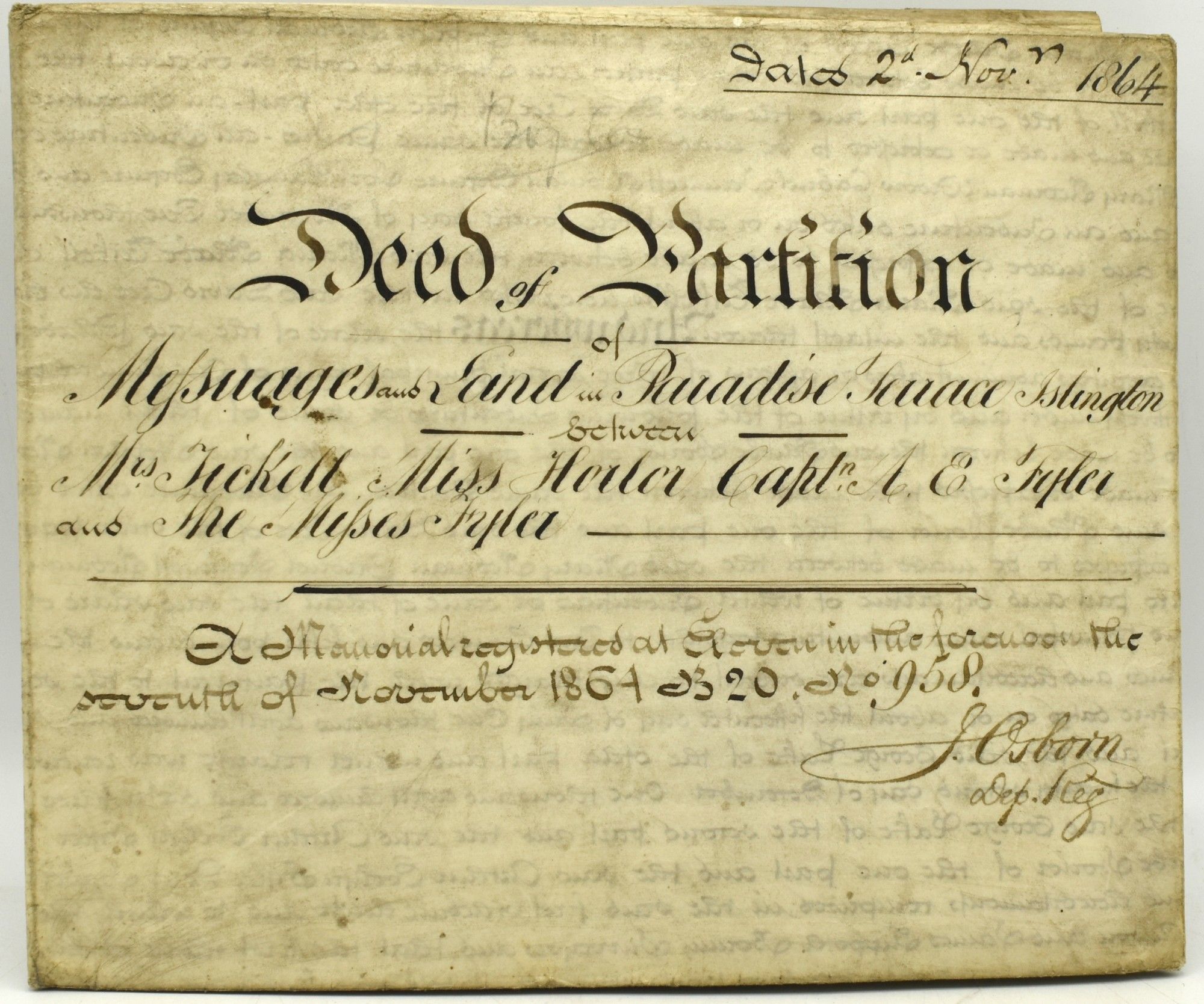 An indenture in three sheets for the partition of "messauges and land" in Paradise Terrace, Islington between a Mrs. Tickell, a Miss Horter, Capt. Arthur Evelyn Tyler and the Misses Tyler; apparently executed by David Cree, solicitor in Bush Lane in the City of London.~~Dated 2nd November, 1864.~~The elaborate forms for the Indenture were sold by "G. Tyler & Sons, Law Stationer, 44 Carey Street, Lincoln's Inn". The sheets are approximately 22" x 25", with rules in red and mostly hand-lettered. The three sheets are tied at the bottom corners with pink ribbons.~~.