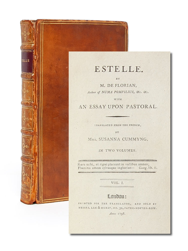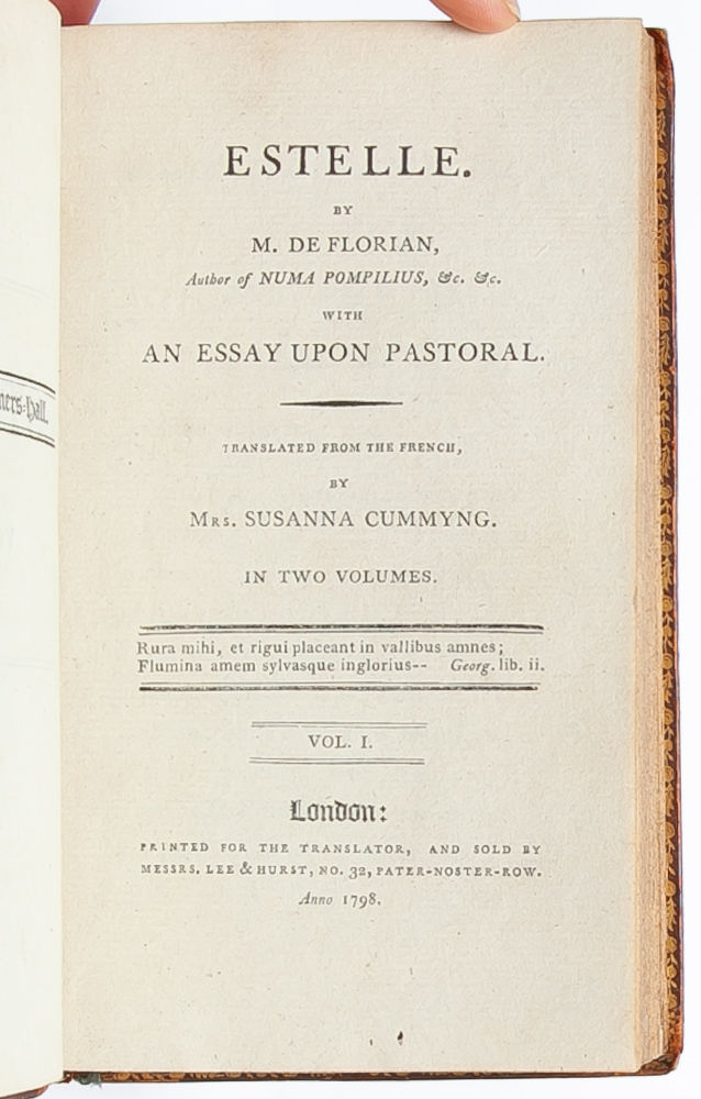 The first, and apparently the only, translation published by Susanna Cummyng, who released Estelle when she was 18 years old. The book's frontmatter give us clues into who the young woman was, as well as her possible motivations for the project. Likely conducted as a result of her education, Estelle is dedicated to Berkhamsted School headmaster Rev. John Dupre, whom Cummyng thanks for his "disposition to encourage those literary pursuits which have a tendency to promote virtue." And in the preface, Cummyng herself is described as "only eighteen years of age," drawn to translation because the "style and beauty of the following work induced her to engage in it for her own improvement." Certainly Louis Pierre Claris de Florian's Estelle was praised at its 1788 release and quickly gained a reputation as one of the most important pastoral novels in French literature. Drawing on Roman mythology, Estelle is a narrative of female desire, duty, and sacrifice -- one in which the heroine's life path is dictated not by following her own heart, but by giving up her love in order to fulfill a bond of honor between her father and a man who saved him. The novel has all of the qualities the English so often marked as detrimental to young female minds. So it is notable that Cummyng not only chooses it, but works in her paratexts to establish both the story and her efforts to translate it as virtuous and self-improving. Such a justification could protect her reputation, as could Dupre's patronism and the support of all the local subscribers in the list who were likely her neighbors and friends.