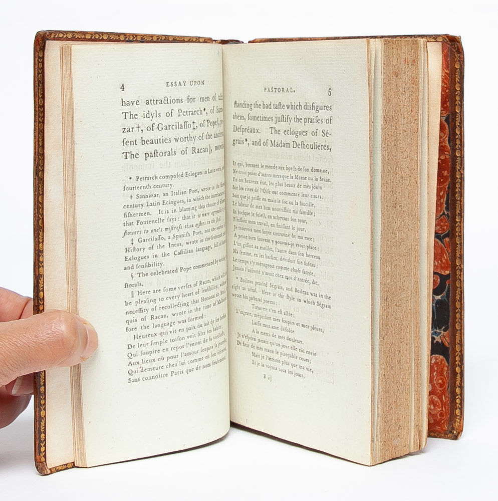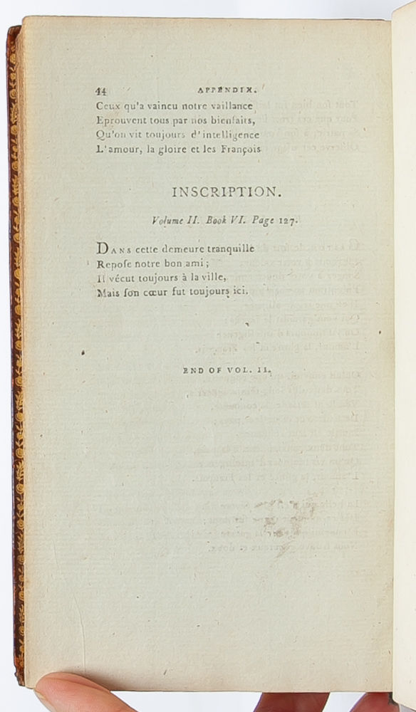 London: Printed for the translator, 1798. First Thus. Contemporary full polished calf with gilt to spine and boards; morocco spine label replaced. Measuring 160 x 95mm. All edges speckled red. Marbled endpapers. Some chipping and loss to spine extremities; joints rubbed and tender, but holding well. Small chip to rear board. Externally pleasing. Armorial bookplate of Charles Henry Rich to front pastedown. Internally fresh and unmarked, without the foxing typical of the era. Collating complete including half title: xii, 147, [1, blank]; [2], 127, [1, blank], 44. The first edition of Cummyng's translation, which was the second edition in English and the second edition translated by a woman (the first being the 1791 translation by Elizabeth Morgan). Both translations are scarce institutionally and in trade, with ESTC recording Morgan's at only 5 libraries and Cummyng's at only 7 libraries. While Morgan's translation has not come to auction, Cummyng's translation has appeared once, over a decade ago. The present is the only copy of either edition on the market.