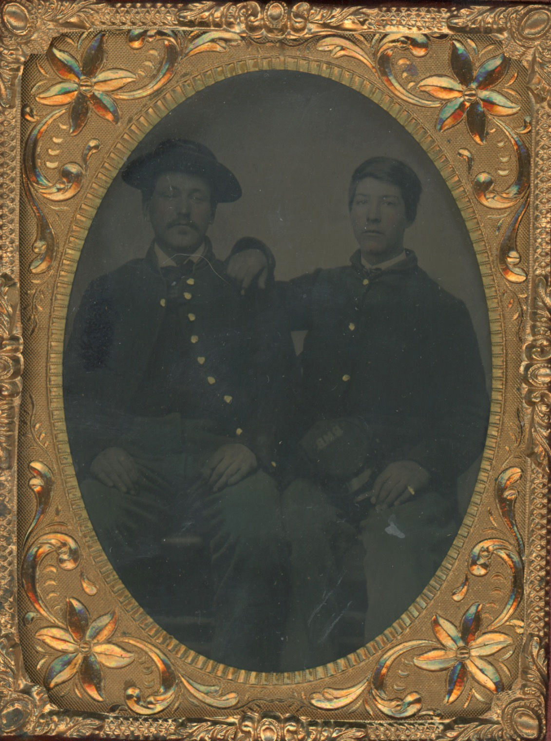 American, 1860. Tintype measuring 3 ½ x 2 ½ inches in oval case, lacking front panel. A fine example. Fine. A particularly striking portrait of two Union soldiers seated together. Their resemblance suggests that they might be brothers.