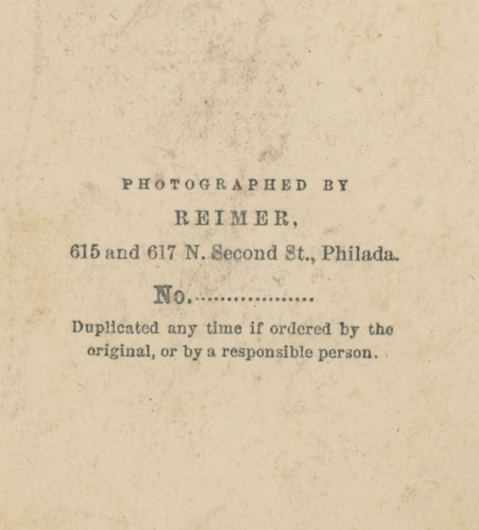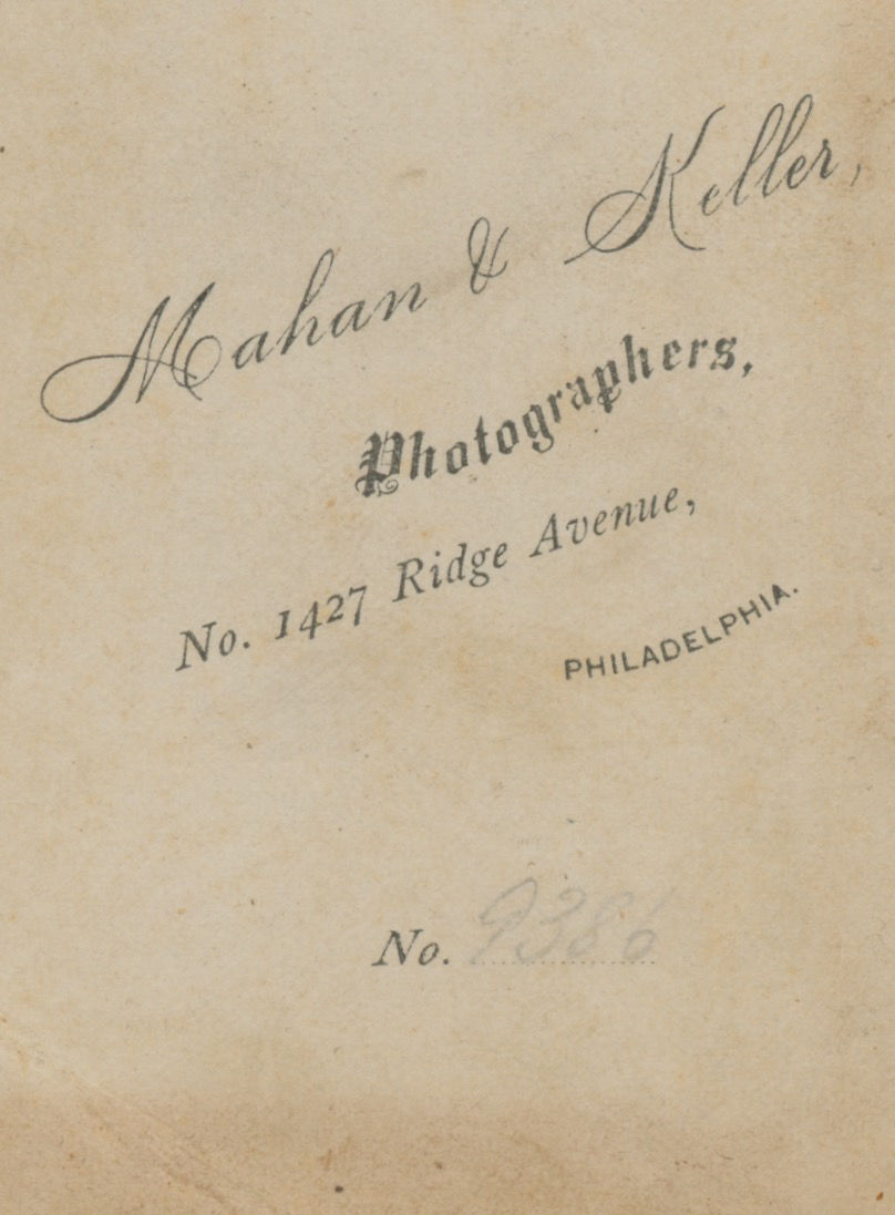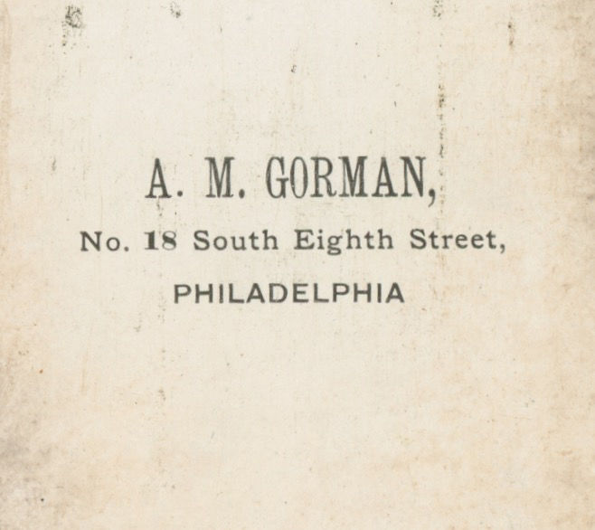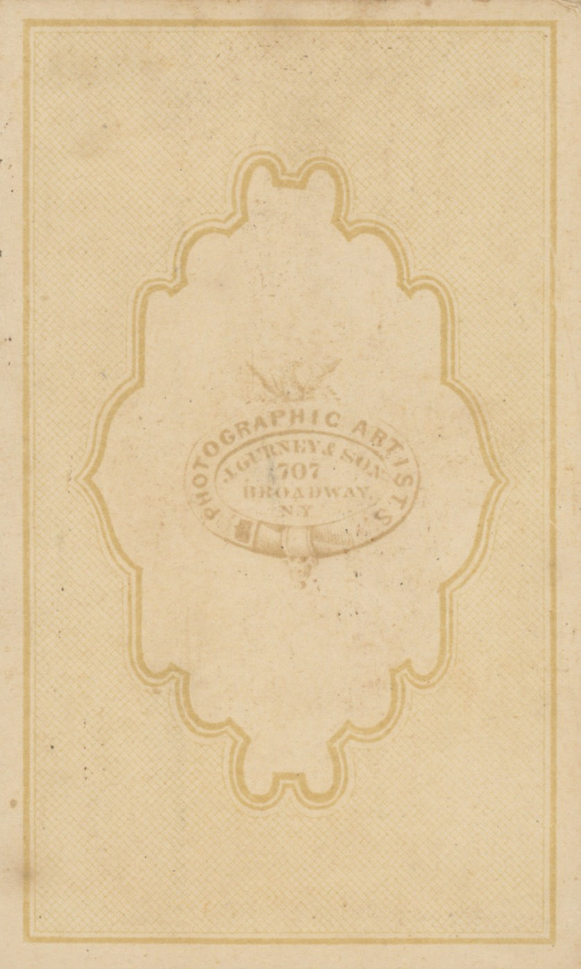 On balance we believe the album to be assembled in the late 1860s, though we cannot give a specific date as none of the photographs are dated and the nature of album assembly makes it difficult to pin down exactly. The biggest clue may be the inclusion of one image taken by Gurney and Son in their 707 Broadway Studio, which was in use from the 1860s until their move to 5th Avenue in 1869. Other clues follow. John Kelly’s tenure began in 1860 and this appears to be a young picture of him. Among the photographic backmarks are the Mahan and Keller firm, with the 1427 Ridge Avenue address being different from their address listed in the 1876 trade literature. One backstamp is for the photographer Oliver Boudrias DeMorat, who was active from the 1850s onward. One photograph has the backstamp of A.M. Gorman, identical to a photograph held at the Getty which they dated to 1865-1870.