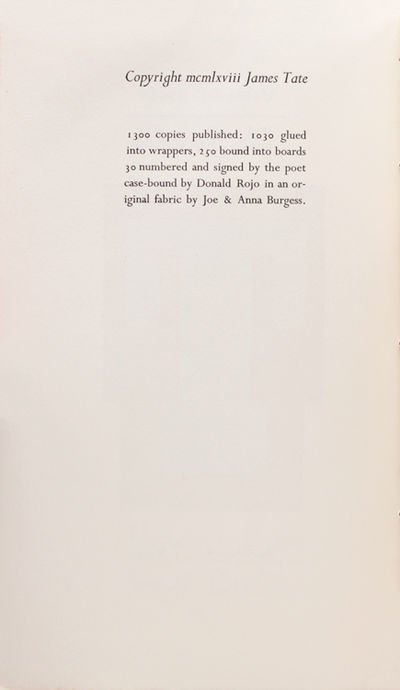 Santa Barbara: Unicorn Press, 1968. First edition, clothbound issue, limited to 250 copies. Design and cover by Alan Brilliant. 38pp. 8vo. A fine copy (partially unopened) [issued without dust jacket]. First edition, clothbound issue, limited to 250 copies. Design and cover by Alan Brilliant. 38pp. 8vo.
