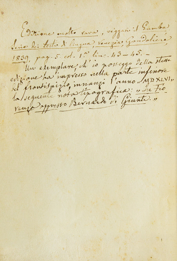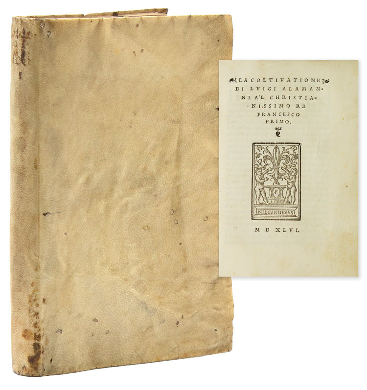 Florence: Bernardo Giunta, 1546. Second edition, first to be printed in Italy. [1, blank], 102, [1] leaves. Woodcut device on title and verso of the terminal leaf. 8vo. Contemporary vellum. Second edition, first to be printed in Italy. [1, blank], 102, [1] leaves. Woodcut device on title and verso of the terminal leaf. 8vo. Second edition of Alamanni's pastoral masterpiece, composed in the manner of Virgil's Georgics. This edition was the first to be printed in Italy (the first edition printed in Paris by Robert Estienne). Adams A-410; Renouard p. lv, no. 38; Gamba 17n; Brunet I 125-126