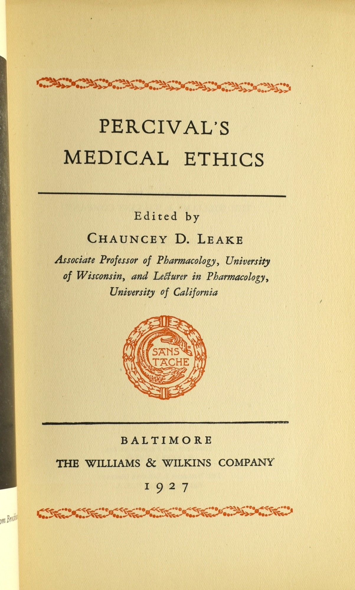 Baltimore: The Williams & Wilkins Company, 1927. First Edition Thus. Hard Cover. Very Good binding. 8vo.; in the publisher's green paper-covered boards, backed in green cloth with titling in gilt which is a bit faded; [xi], [2], 291 pages including the Index; [4] pages "Sans Tache";frontispiece; there are no marks of any kind in this attractive book.~~First published in 1794 (for private circulation), the British and American medical professions have adopted much of "Percival" in their ethical codes.~~ (Garrison-Morton 1764). Very Good binding.