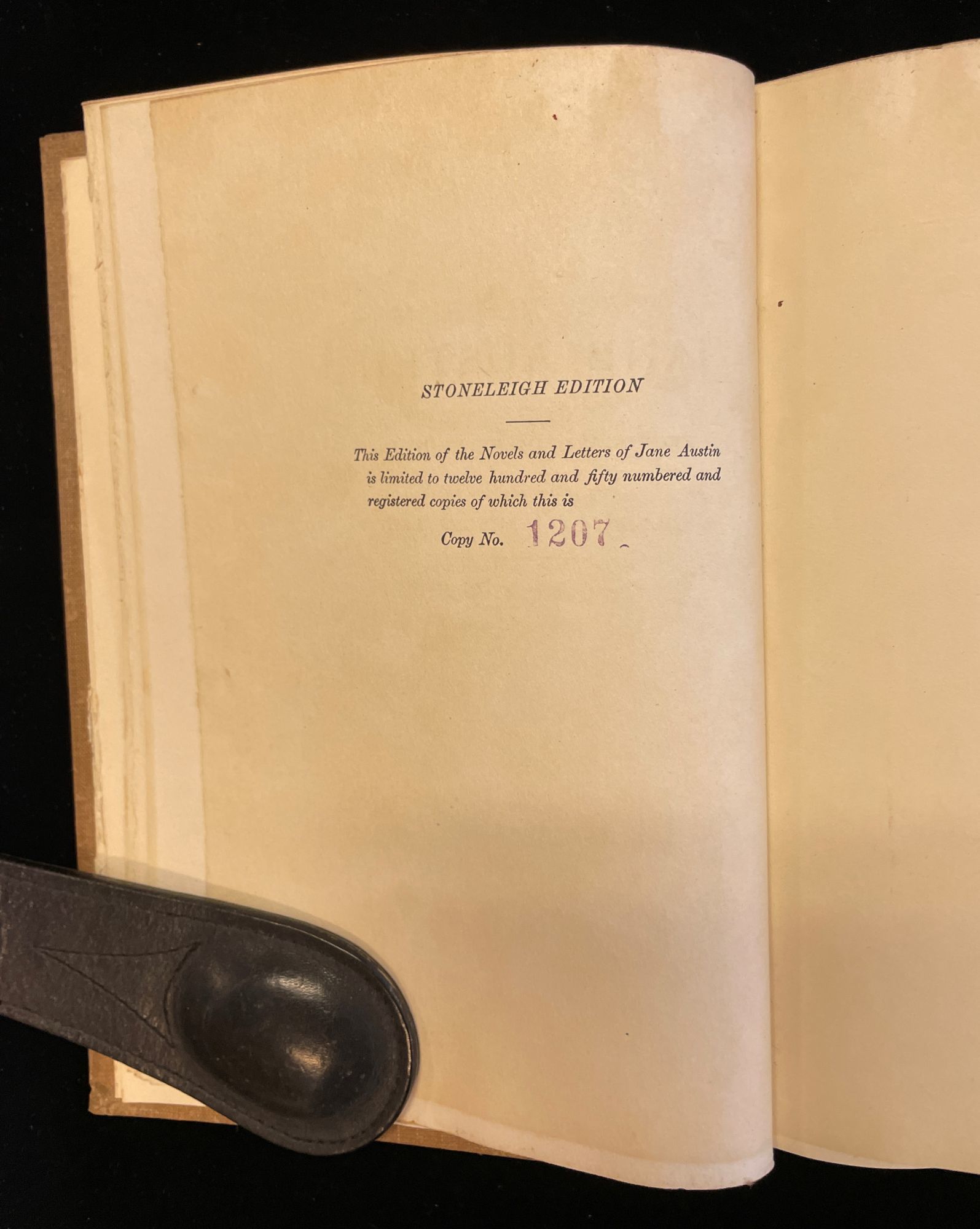 NY: Frank S. Holby, 1906. 1st Edition Thus. Hardcover. Very Good +. Complete set, 8vo, tan linen, paper title labels, spine, gte, sides uncut. Limited to 1250 copies, this set 1207, with the exception of volume IX, Northanger Abbey, which is a replacement volume numbered 759. Solid, clean copies all around. Some incidental wear to covers, and labels browned. Firm bindings, no names/bookplates, except on the second flyleaf in volume IX. A handy, readable set.