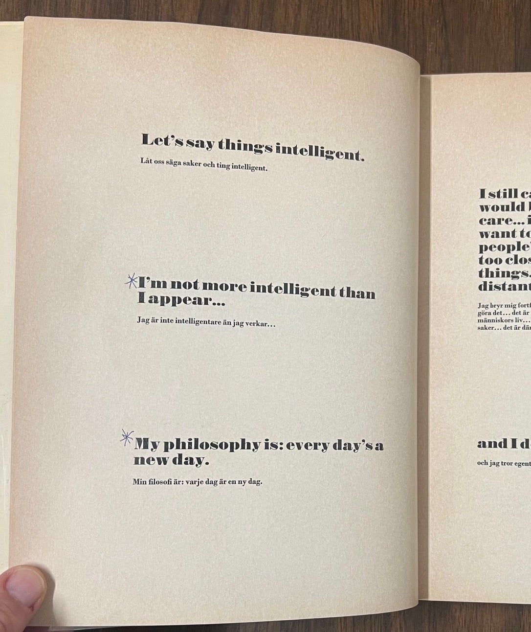 Stockholm: Moderna Museet, 1968. First. paperback. very good(+). Warhol. A fascinating book with almost no text, but packed with hundreds of b/w photographs of Warhol's work as well as many images of members of The Factory at work and play. Unpaginated, but approximately 600 pages printed on very thin delicate paper. 4to, bright color pictorial wrappers featuring Warhol's iconic Flowers (very minimal edgewear overall but for a reading crease and some chipping at spine ends and one 2" tear at lower rear gutter; ownership signature on title, and unfortunately with 15 neat ballpoint asterixes on the preliminary text; pages toned as usual). Stockholm: Moderna Museet, 1968. First edition. Despite faults, a very good(+) copy of this scarce and collectible (and notoriously delicate) book.
