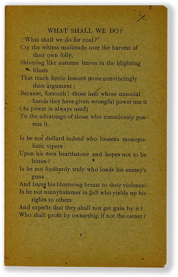 Prints the text of Labadie's poem "What Shall We Do?," which originally appeared in the Detroit News for Oct 22, 1902. Concludes with a brief agitational paragraph: "Capitalism has failed all along the line...What's the alternative? Free Socialism, under which the worker is guaranteed the job and all that's in it. If not why not?" Brown University only in OCLC.