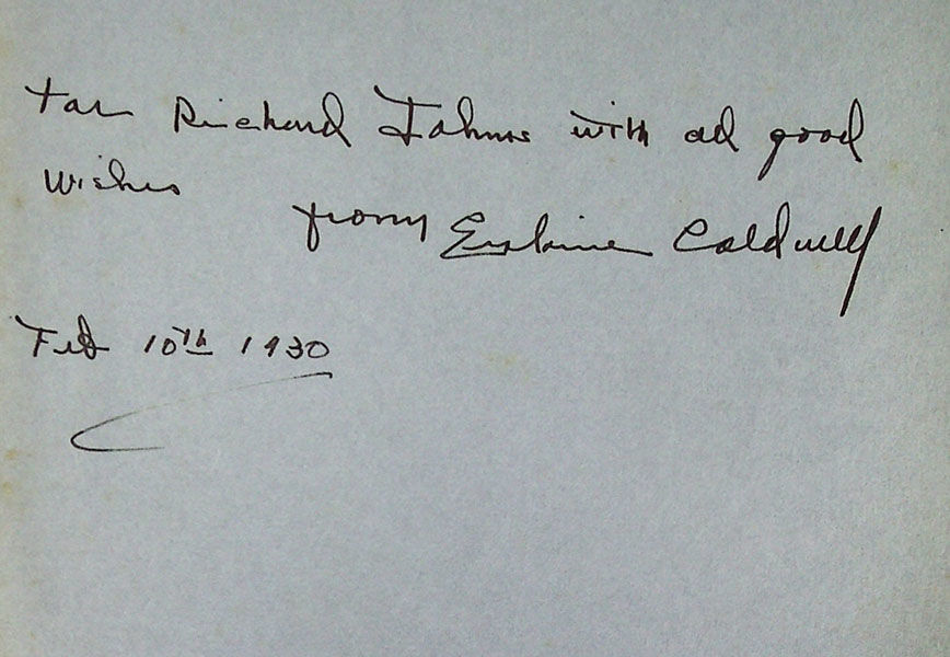 New York: Heron Press Incorporated, 1929. First Edition. One of 900 numbered copies on Mellow Book, bound in Holliston Cloth (of a total edition of 1100). Inscribed on front free endpaper to American poet and editor Richard Johns. Octavo (25.5cm.); original purple gilt-lettered cloth; 199pp.; frontispiece and 5 plates; title page printed within purple decorative border. Unprinted acetate protector. Spine and covers heavily sunned, with faint dampstain to cloth at base of spine; text slightly aged with a few faint spots of foxing to prelims. A sound but unattractive copy, no better than Good, its flaws mostly hidden by a later custom board slipcase. A significant association copy of Caldwell's first book. Johns (1904-1970) was at this time the editor of Pagany, a short-lived but influential experimental magazine in which Caldwell succeeded in placing a number of early stories. Caldwell's and Johns's correspondence, held at the University of Delaware, "highlights," in the words of one critic, how this literary friendship helped Caldwell "find his way into the contemporary American canon...and reveals some surprising tastes, including admiration for William Carlos Williams and John Dos Passos, as well as dozens of lesser known authors..." (Dan B. Miller, Review of Erskine Caldwell and the Fiction of Poverty by Sylvia Jenkins Cook. In The Southern Literary Journal, vol. 25, no 2 (Spring 1993).