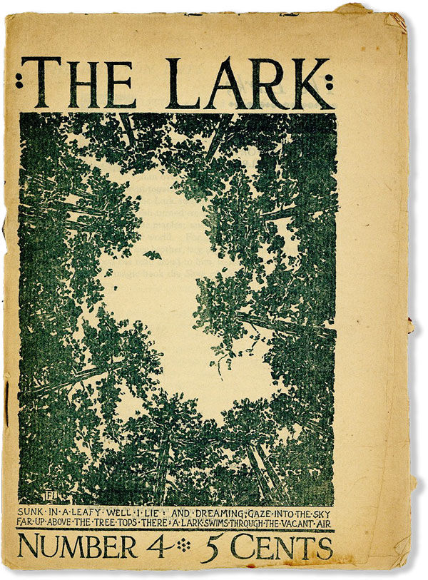 Single issue of perhaps the most whimsical and iconoclastic of the "little magazines" that appeared in the 1890s. The Lark was dedicated to "sincerity, spontaneity, and gaiety," and featured nonsense verse and illustrations printed on thin (and frequently brittle) bamboo paper, with a deliberately informal aesthetic (Chielens, American Literary Magazines 208-9). With contributions from "fin-de-siecle San Francisco's most promising writers and artists," it helped to establish the city as "the literary center of the Pacific Coast" (209, 212). More commonly found in the bound two-volume issue.