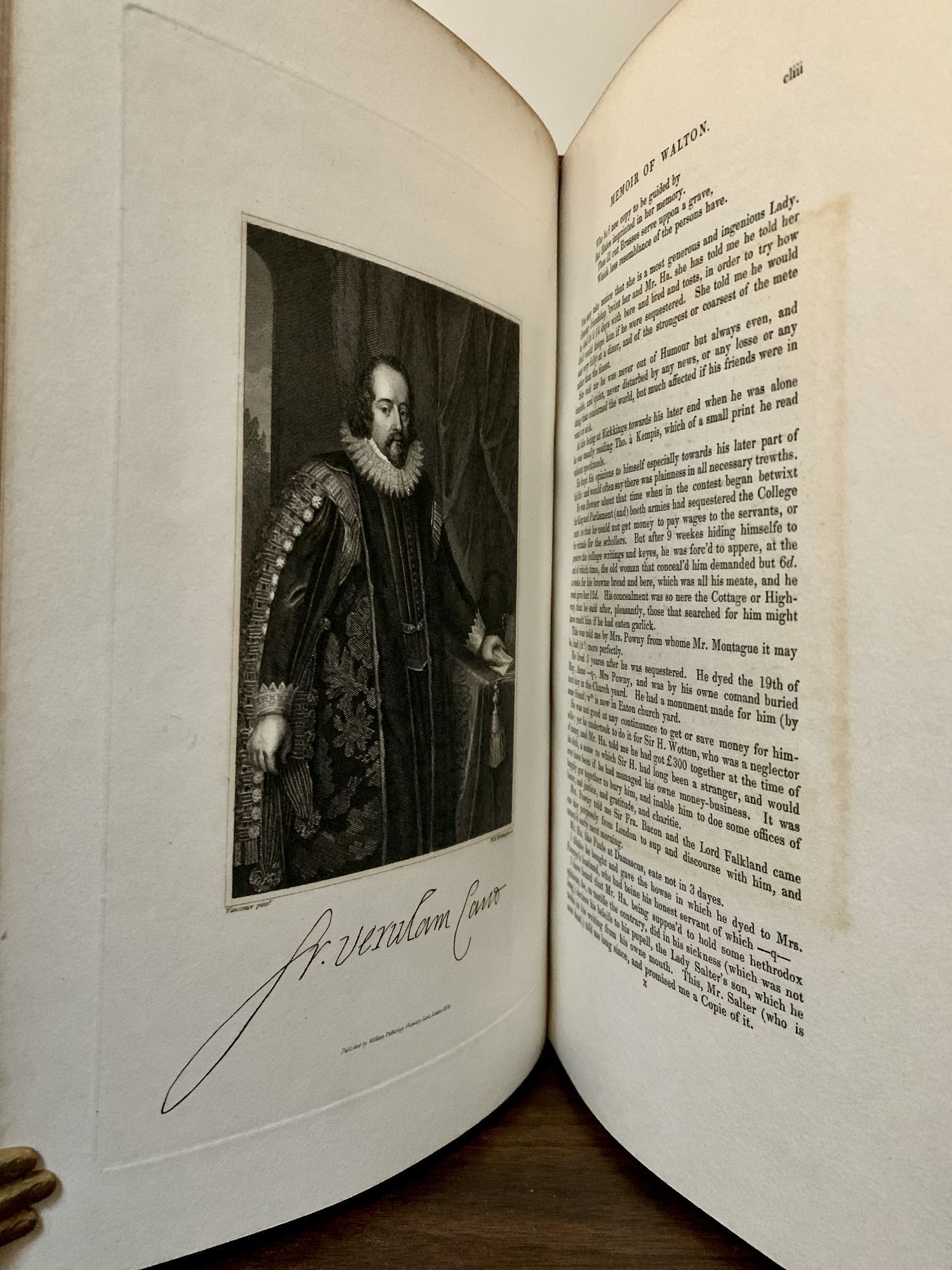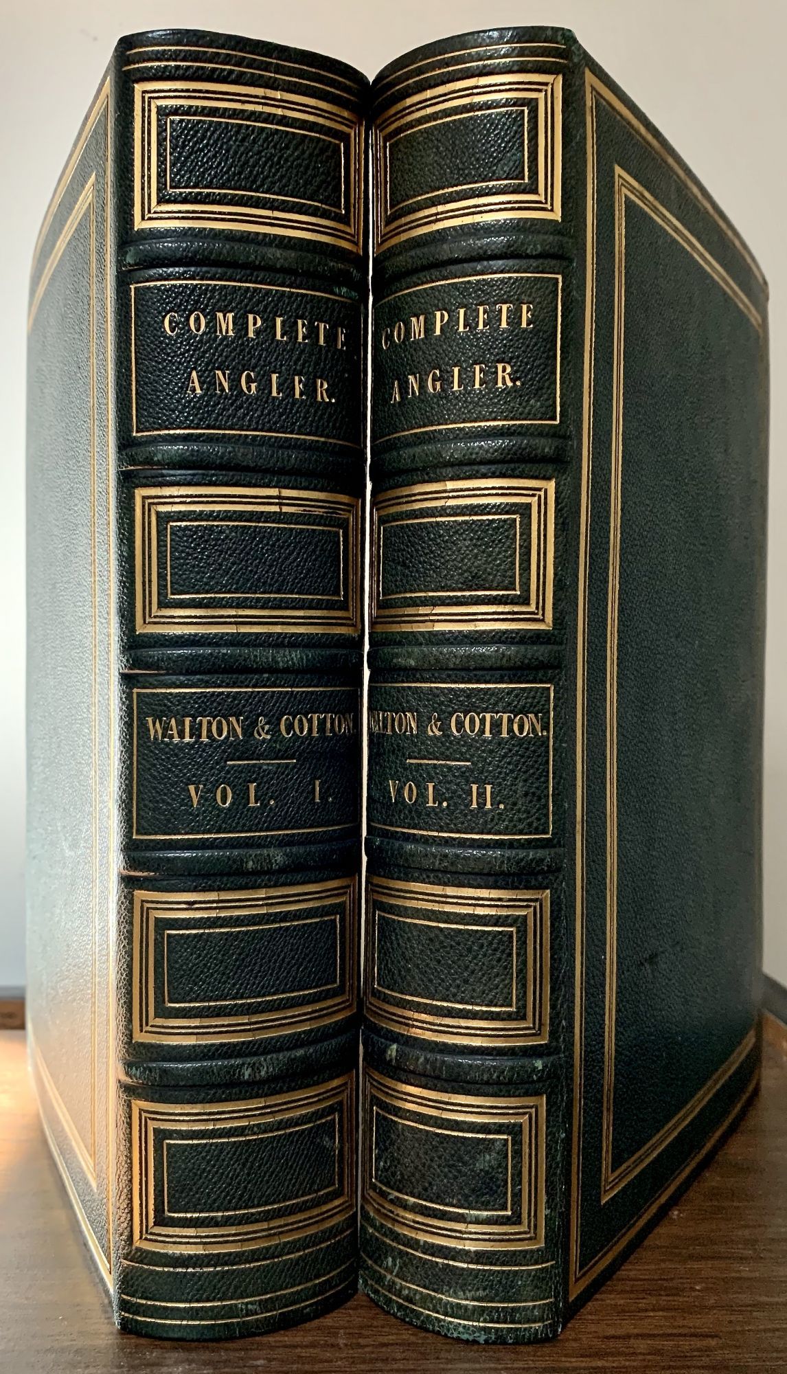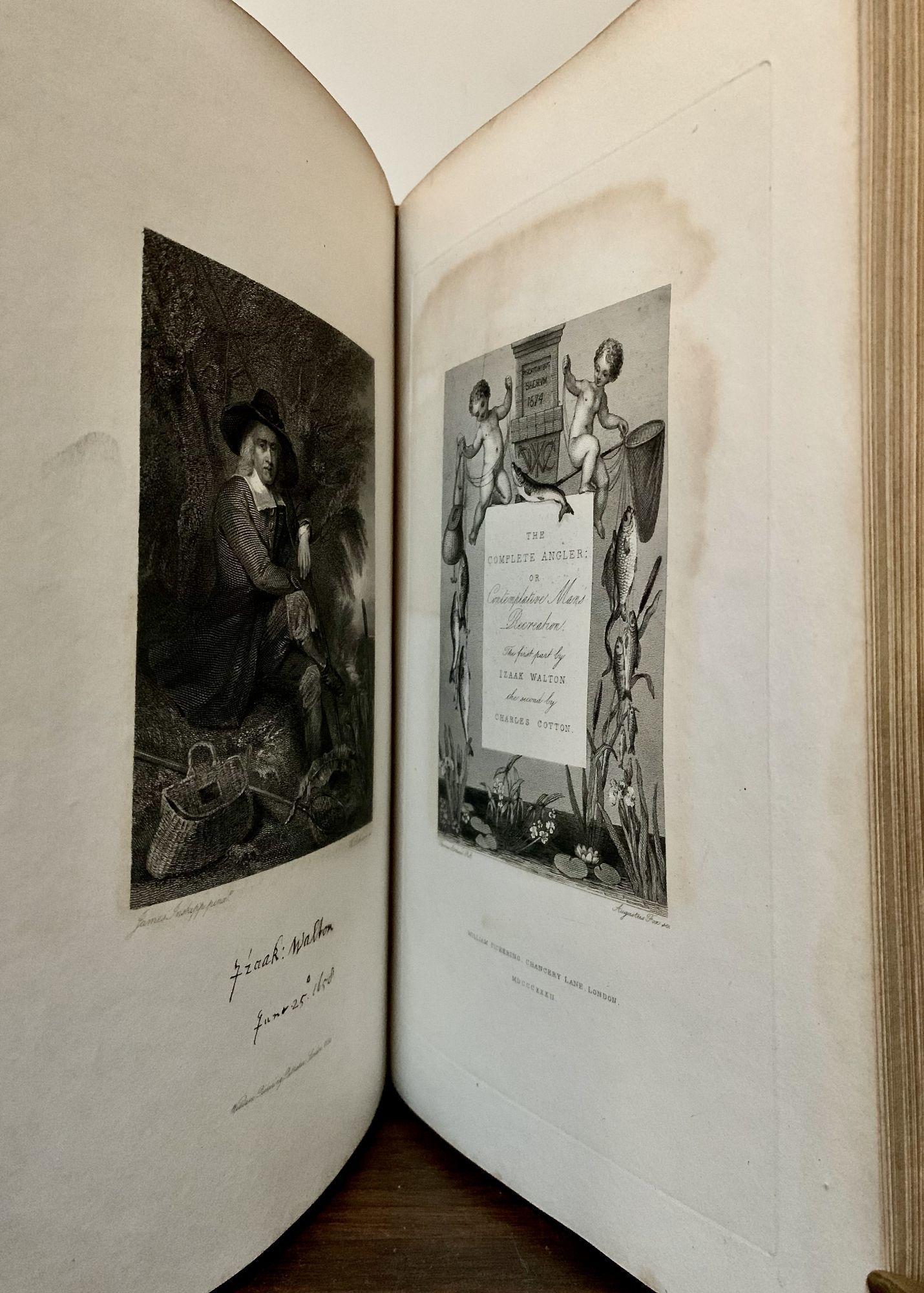 London: William Pickering, 1836. leather_bound. Contemporary dark green morocco, double gilt cover border panels, gilt paneled raised bands. Aeg. Near fine. 3 Vols. (ccxii) 436 pages (16 pp. Index at rear). 27 x 18 cm. Large Paper copy of the first Nicholas Edition, half titles, titles printed in red and black, numerous engraved head pieces, illustrated throughout, and extra Illustrated with forty five full page engraved plates, including fifteen proofs on India paper. With an additional portrait of Walton laid-in. PERCY MUIR, VICTORIAN ILLUSTRATED BOOKS. p.21. "one of the best, possibly the very best of ,,,the 146 editions of the Compleat Angler published between 1836 and 1901, with engravings after Stothard (scenery), Inskipp (fishes) and others." The text follows that of the fifth edition of 1676 which was the last edition revised by Walton himself and the variations of the four preceding editions are indicated at the foot of each page. Marginal spotting, minor offsetting of plates to text, a few leaves with dampstain at margins.