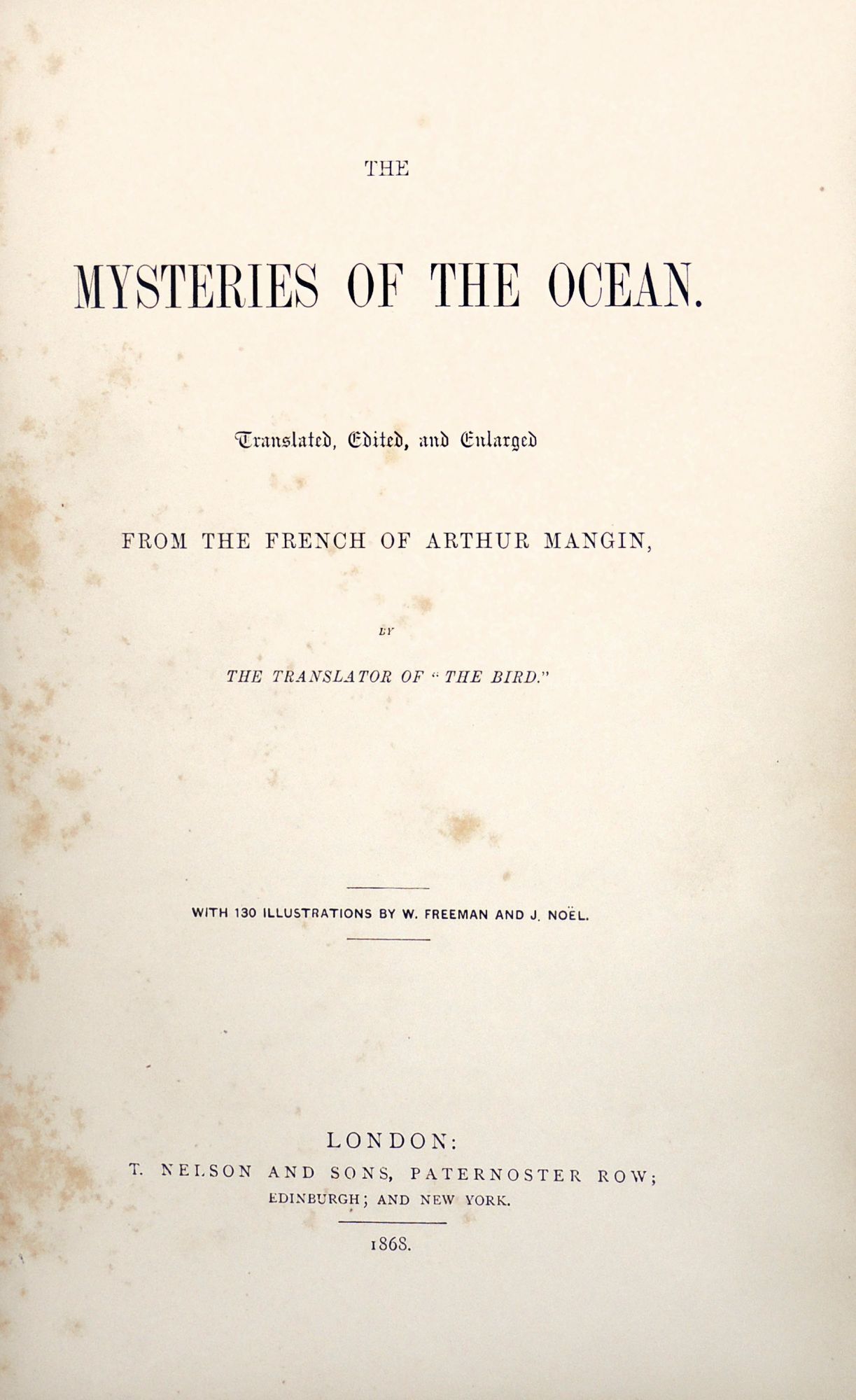 London: T. Nelson and Sons, 1868. Hardcover. Very Good. Hardcover. First English edition of this interesting and accessible translation of Mangin's work, first published in 1864. Arthur Mangin (1824-1887) was a well-known science writer and popularizer of scientific knowledge who is said to have inspired Jules Verne. The translator, William Henry Davenport Adams (1828-1891) was a well known English historian. Mangin writes of all aspects of the ocean, including its history and phenomena, and of its multitude of creatures, even the mythical kraken. With 130 full page and text and black and white illustrations by W. Freeman and J. Noël.