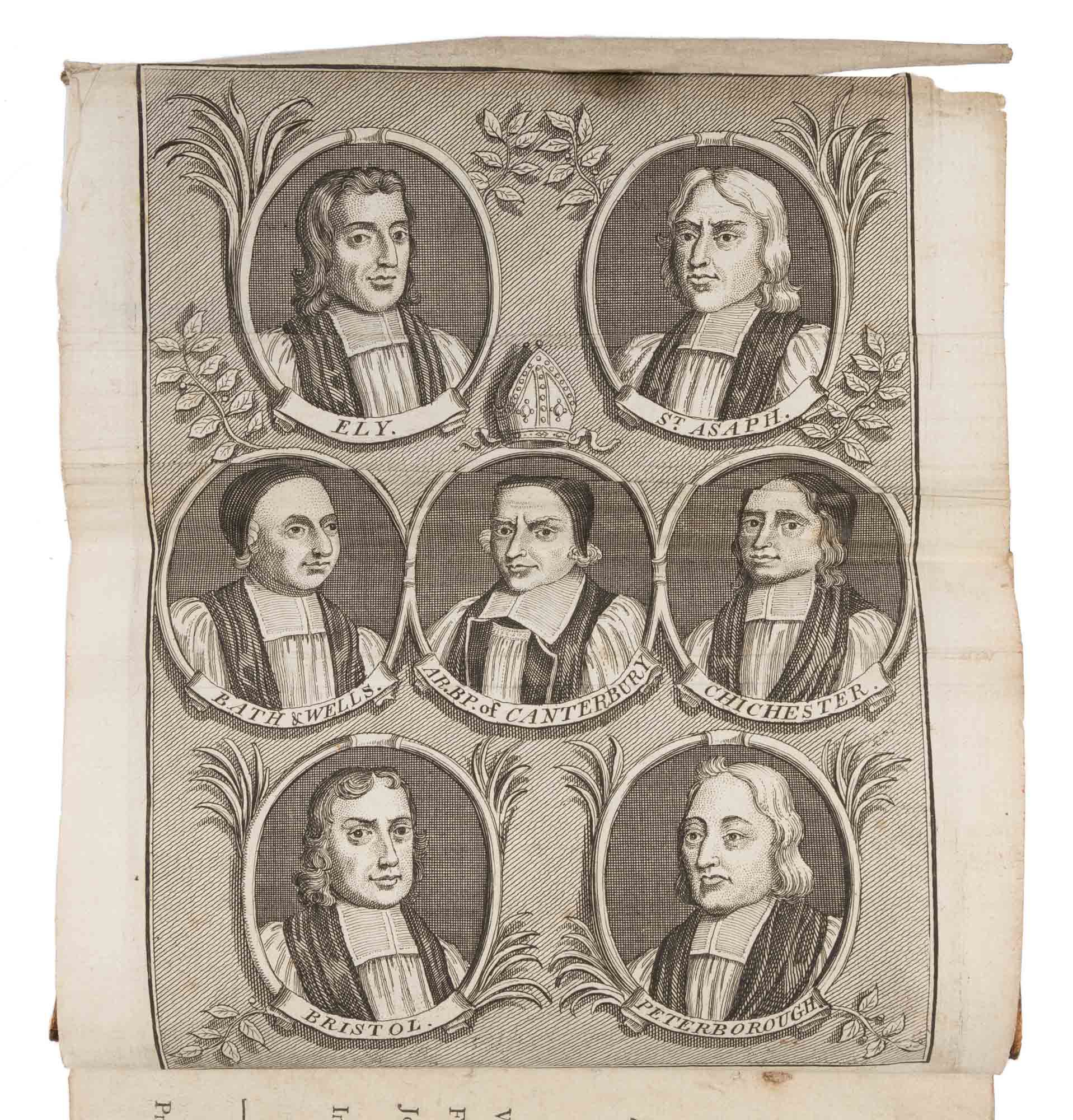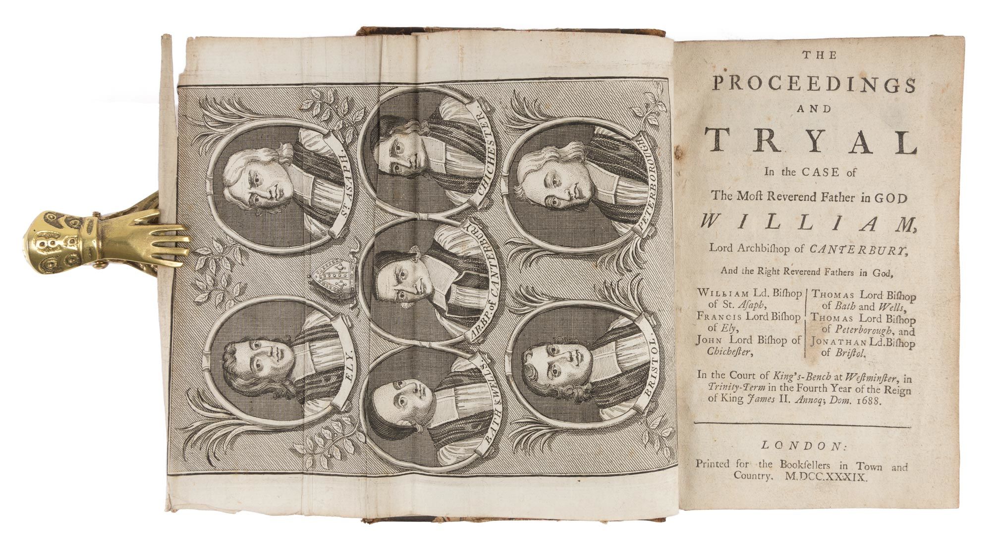 1739. The Trial of the Seven Bishops [Trials]. [Sancroft, William (1617-1693), Et Al. Defendants]. The Proceedings and Tryal in the Case of The Most Reverend Father in God William, Lord Archbishop of Canterbury, And the Right Reverend Fathers in God, William Ld. Bishop of Asaph, Francis Lord Bishop of Ely, John Lord Bishop of Chichester, Thomas Lord Bishop of Bath and Wells, Thomas Lord Bishop of Peterborough, and Jonathan Ld. Bishop of Bristol. In the Court of Kings-Bench at Westminster, in Trinity-Term in the Fourth Year of the Reign of King James the Second, Annoque; Dom. 1688. London: Printed for the Booksellers in Town and Country, 1739. 431 pp. Folding copperplate portrait frontispiece of the seven bishops. Octavo (6-1/2" x 4-1/4"). Later three-quarter calf over marbled boards, gilt spine with raised bands. Moderate rubbing to boards, heavier rubbing to extremities with some wear to board edges, a few small chips to spine ends, corners bumped and somewhat worn, hinges starting, "Hanch Hall" in nineteenth-century hand to front pastedown. Light toning to interior, edgewear to head of folding plate just touching border of image, faint smudges to a few laves, light soiling to title page. $500. * Third, final and best edition of a work first published in 1689. In 1688 James II reissued his Declaration of Indulgence, which suspended the penal laws enacted against Catholics and dissenters, and ordered the Anglican clergy to read it to their congregations. The Archbishop of Canterbury and six bishops petitioned against this order on the ground that the suspending power had been declared illegal by Parliament. They were indicted in the King's Bench for seditious libel, but were acquitted to great public acclaim. The "Trial of the Seven Bishops," as it came to be known, confirmed the subject's right to petition the crown. Moreover, by assigning the questions of publication and libel to a jury the court set a precedent that was later enacted into law by the Fox Libel Act of 1792. The trial also reflects the antipathy of English Protestants towards Catholicism and the Stuarts. Indeed, this trial was one of the events that led to the Glorious Revolution of 1688. English Short-Title Catalogue T100946.