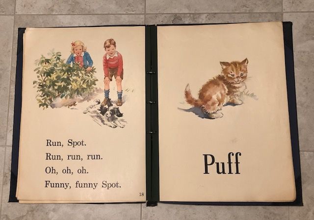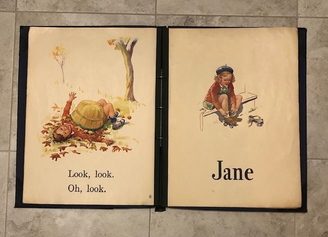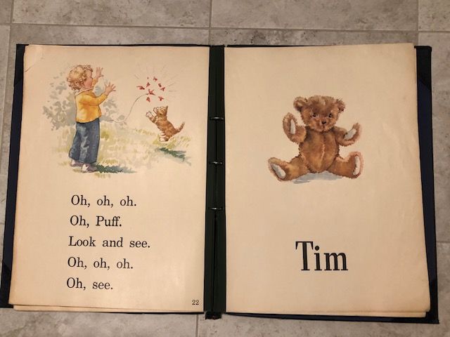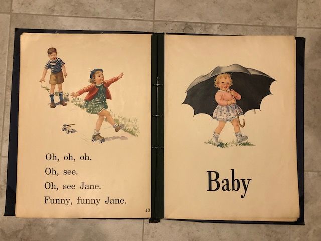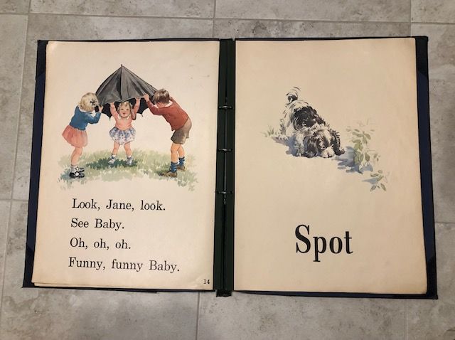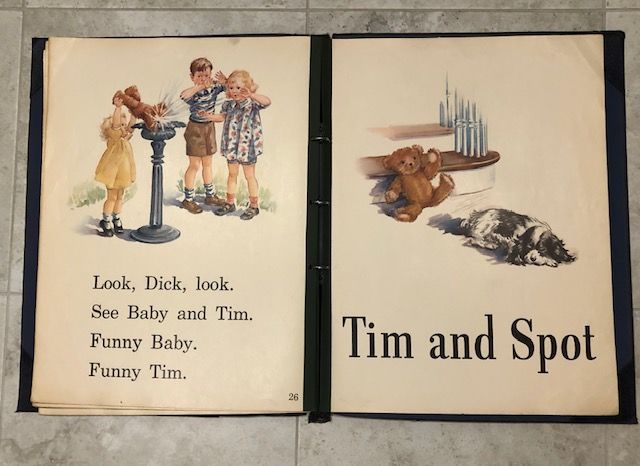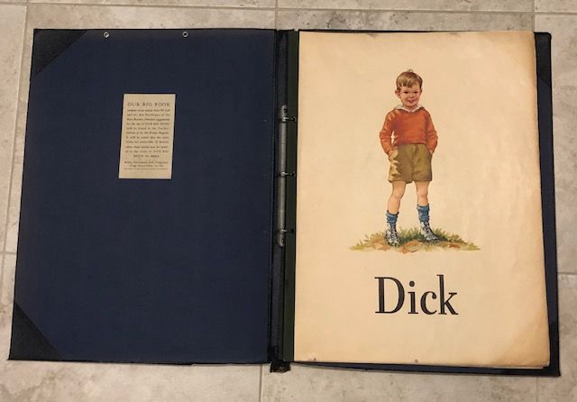 Chicago: Scott, Foreman and Company. Very Good-. Contains seven stories from We Look and See, with Dick and Jane; first Pre-Primer of the Basic Readers. Two page Introductory notes not included. Seven stories three hole punched with green cloth spines housed in a black pebbled cloth three ring binder with stands attached; pages are easily removeable; page size is 18 1/4" x 24 1/2" - printed paper label front cover, printed paper introduction verso of front cover. Seven stories in very good+ condition with slight edge wear. Cover in very good- condition with short tears to spine tips, wear to edges and attached stands. Elephant folio. 28 pp.