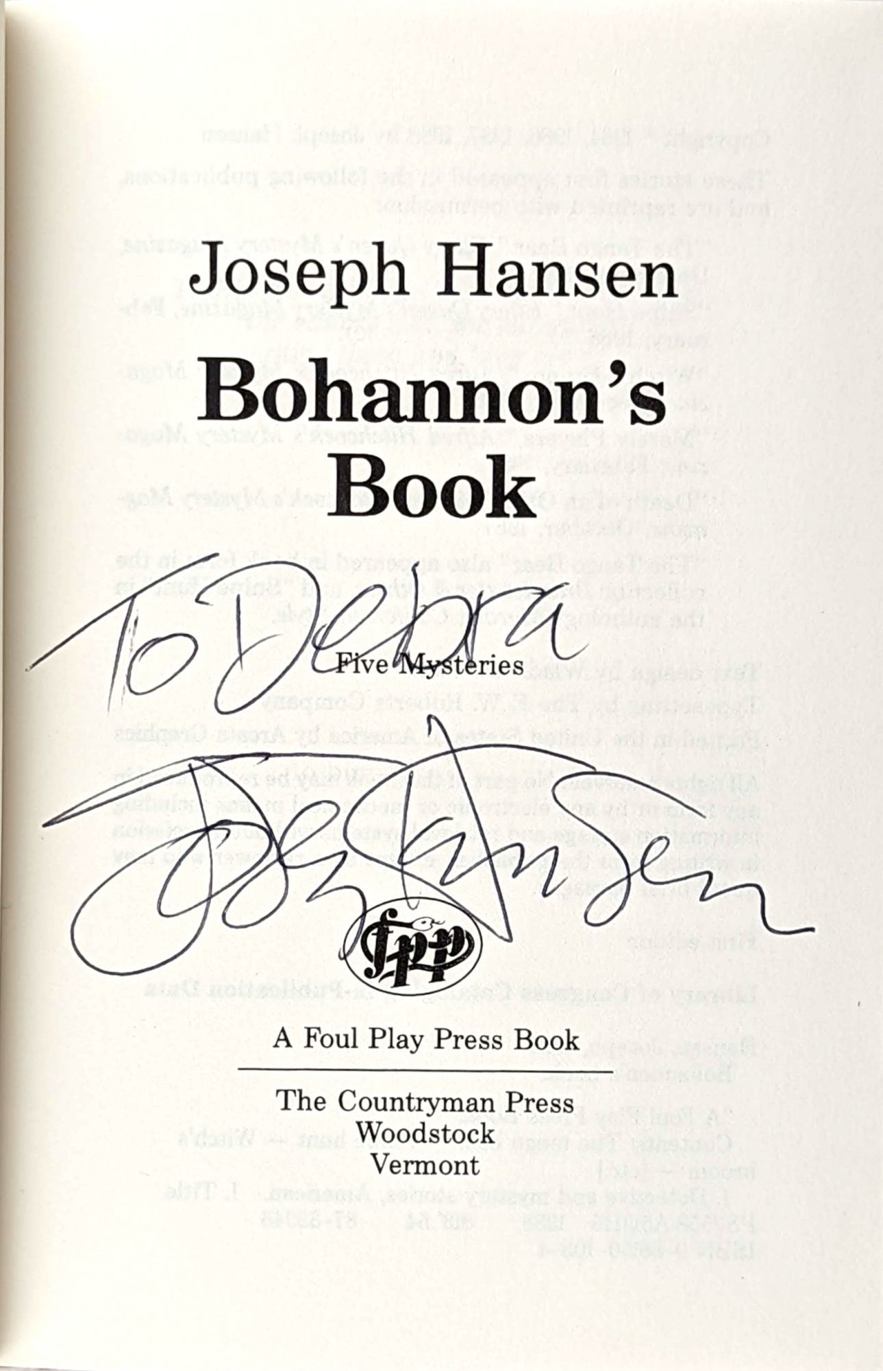 Woodstock, VT: Foul Play Press / Countryman Press, 1988. Very Good/Very Good. Woodstock, Vermont: Foul Play Press / Countryman Press, 1988. Stated First Edition. Signed and inscribed on title page by author: "To Debra / Joseph Hansen." Octavo; 221 pp. Pictorial dust jacket with $16.95 price. Dust jacket is clean and bright, with some light rubbing to edges. Faint cock to spine at head. Binding is tight.