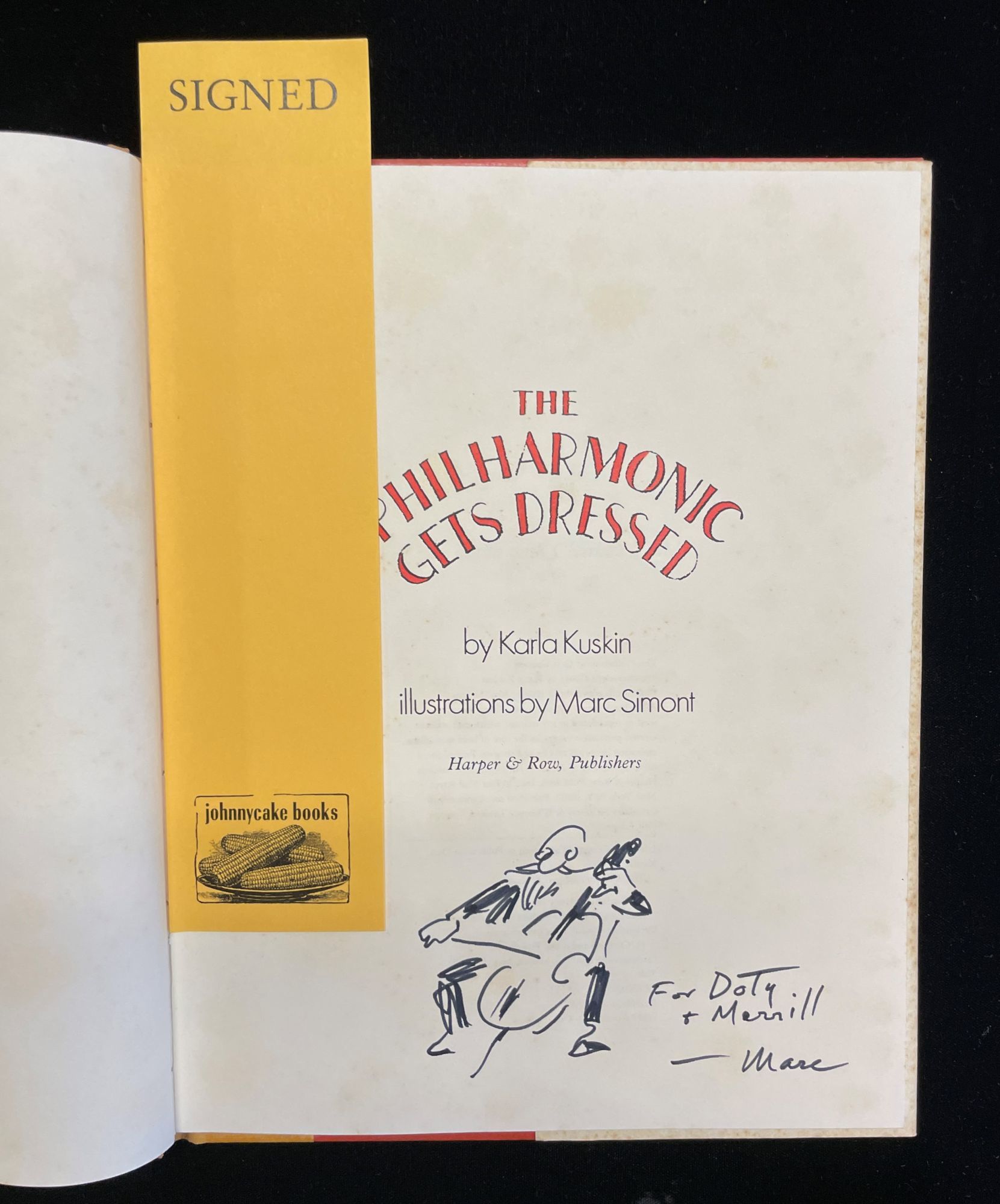 NY: Harper & Row, 1982. 1st Edition. Hardcover. Near Fine/Very Good +. Later children's title illustrated by artist Marc Simont (1915 - 2013), whose long career brought him two Caldecott honors and one Caldecott medal. (Simont also illustrated books for James Thurber, another author/artist, when Thurber's sight failed in later life.) Inscribed to close friends and fellow residents of Cornwall CT where Simont and his family made their home. With an original sketch of a bearded cello player on teh title page. Near fine book. Dustjacket clipped on teh bottom corner of the front flap, a spotted here and there.