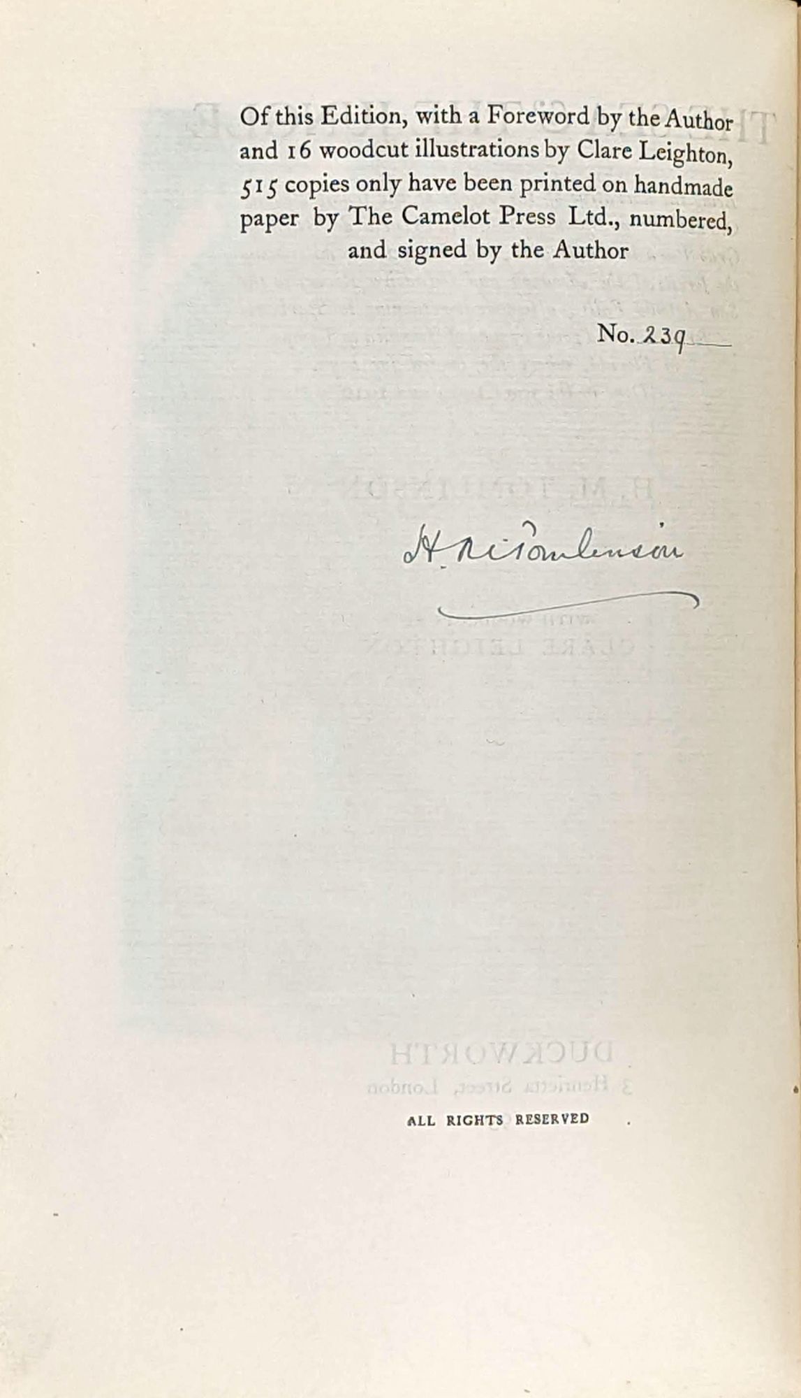 London: Duckworth, 1930. Very Good. London: Duckworth, 1930. Limited Edition. Signed by Tomlinson without inscription and numbered 239 of 515 copies on title page verso. Octav0; 343pp. Woodcuts by Clare Leighton throughout. Green buckram with gilt lettering to spine. Gilt to top page edges, with deckled fore-edge. A few pages at back still uncut. Boards faded along edges and quite so down spine, with some inward curving at corners. Front and back free endpapers toned, with some pencil notations from prior bookseller on front free endpaper and pastedown. Light offsetting opposite woodcuts, else pages clean and unmarked. Binding is sound.
