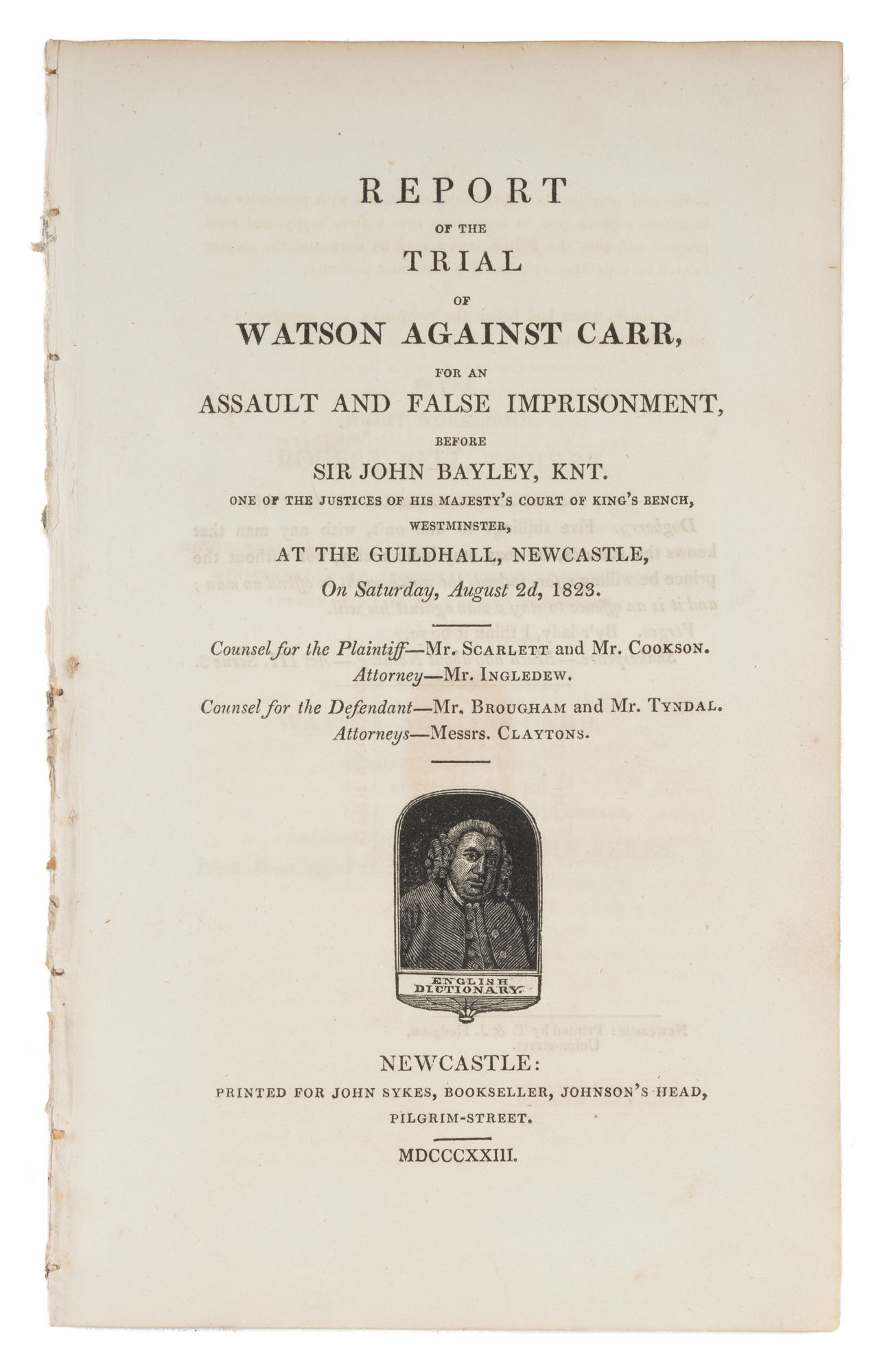 1823. Assault and False Imprisonment [Trial]. Carr, Thomas, Defendant. Report of the Trial of Watson Against Carr, For an Assault and False Imprisonment, Before Sir John Bayley, Knt. One of the Justices of His Majesty's Court of King's Bench, Westminster, At the Guildhall, Newcastle, On Saturday, August 2d, 1823. Newcastle: Printed for John Sykes, Bookseller, 1823. 36 pp. Woodcut title page vignette of Samuel Johnson. Octavo (8-1/2" x 5"). Disbound stab-stitched pamphlet. Moderate toning, light foxing in a few places. $200. * Only edition, one of at least 2 issues from the same year. This scarce trial report concerns the beating and false imprisonment of Thomas Watson by Carr. The latter claimed as his defense his position as Town Constable during the time of incident, and engaged Henry Brougham as his lawyer. The jury found for Watson and Carr was subject to a fine and court costs. Other copies we have seen have a different title page vignette depicting Newcastle's Guildhall. OCLC locates 7 copies of this title, 4 in North America (Harvard Law School, University of Georgia Law School, Temple University, University of Pennsylvania Law School).