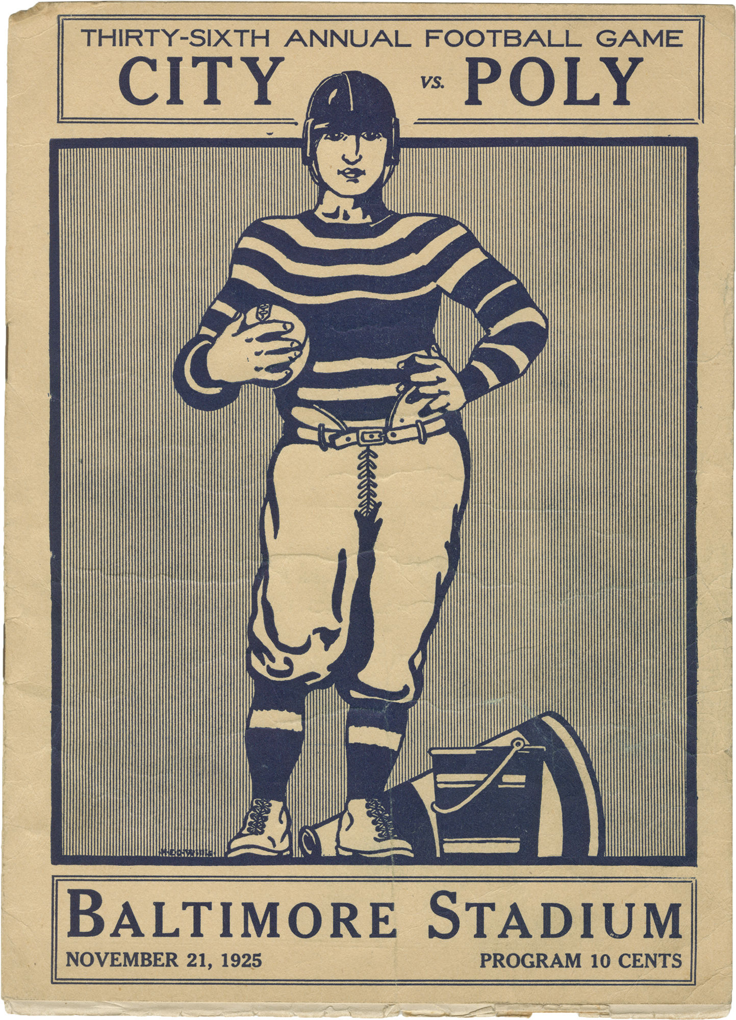 Baltimore: N.p., 1925. Vintage program for a Baltimore City College vs. Baltimore Polytechnic Institute (or what Baltimoreans would call a "City vs. Poly") football game, held at the Baltimore Stadium in 1925. Included with the program is a ticket for the 1943 City vs. Poly game, as well as a small illustrated postcard showing the Polytechnic Institute in north Baltimore.