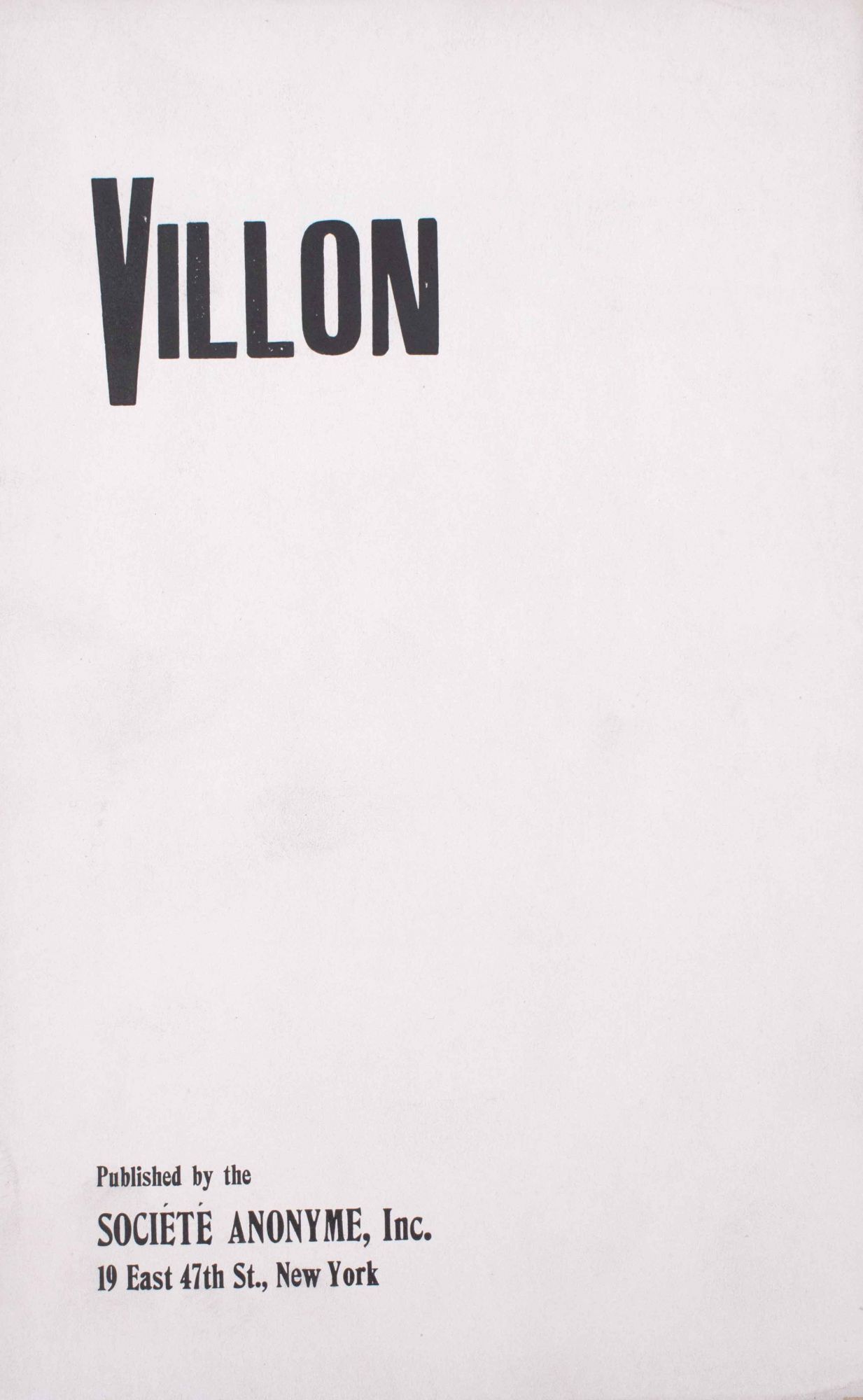 New York: Société Anonyme, Inc, 1922. First edition. 2 black and white illustrations, 12 pp. 8vo. Side-stapled printed wrappers with some light soiling. First edition. 2 black and white illustrations, 12 pp. 8vo. Published in conjunction with the 20th Exhibition of the Société Anonyme at the Galleries of the Société Anonyme, 19 East 47th Street, New York, from December 16th to January 10th, 1922. Pach gave a speed on December 28 on Villon, likely largely reproduced in this catalogue. Collection of the Société Anonyme, p. 218