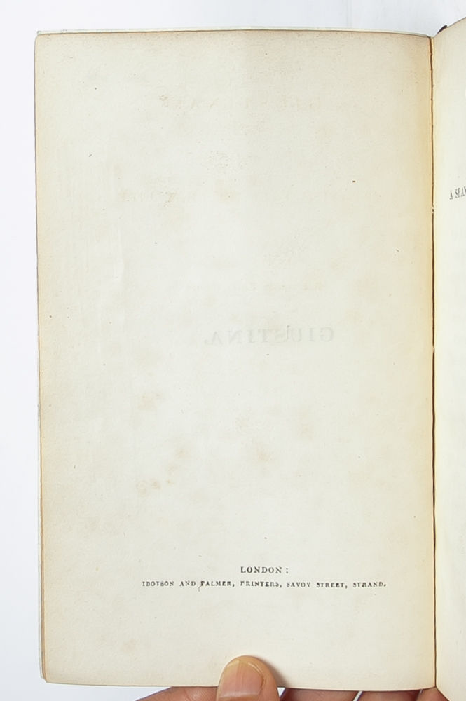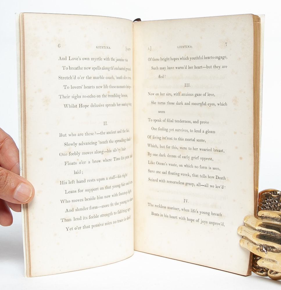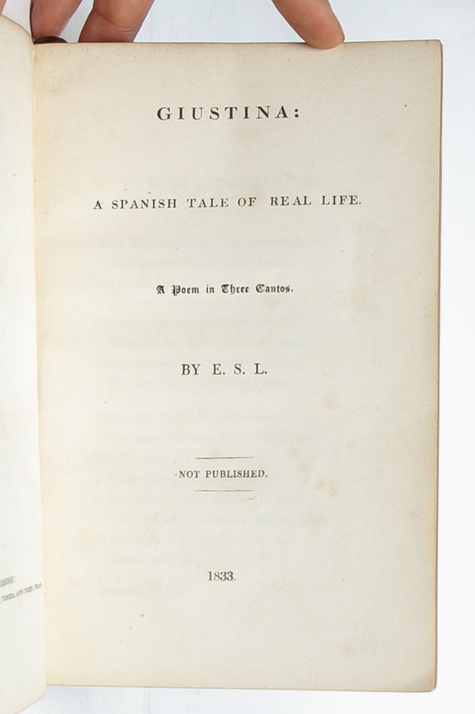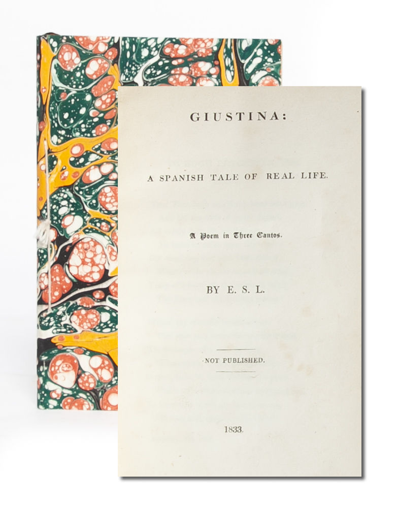 [London]: Not Published [Printed by I Botson and Palmer], 1833. First edition. Recent marbled wraps tied at spine. All edges gilt. Bookplate of J.O. Edwards to verso of front wrap. Ownership stamp of Lady Ulrica Thynne (d. 1916) to front endpaper. A Near Fine copy, with a bit of light scattered foxing throughout. Measuring 180 x 110mm and collating complete including half and full titles: [6], 63, [1, blank]. A scarce work in translation which was only distributed among friends and family, OCLC reports copies of Giustina at only 6 libraries. The present is the only example on the market.