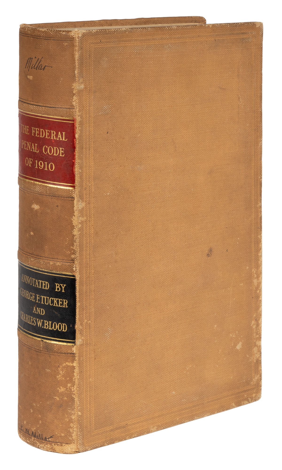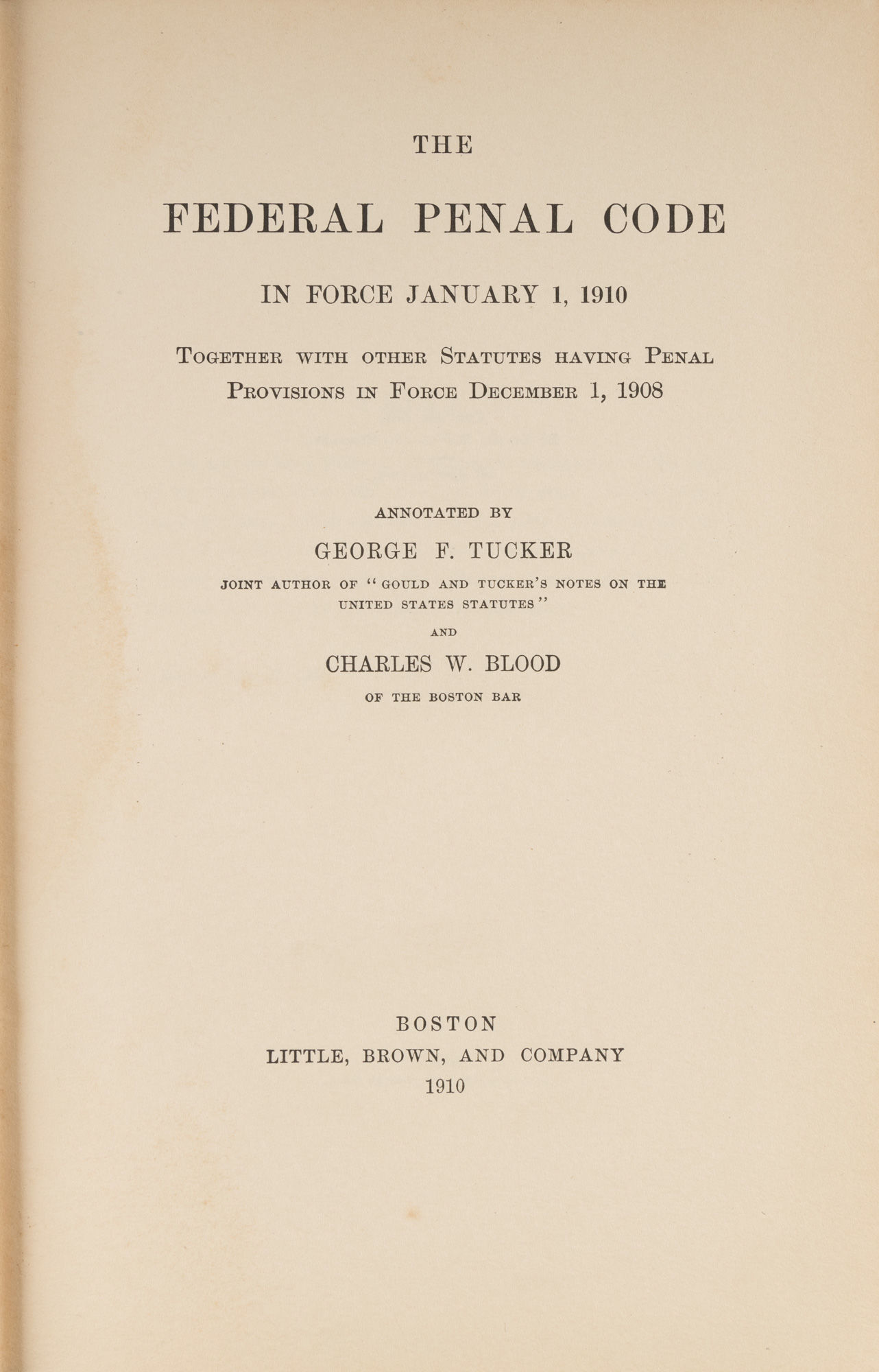 1910. Boston: Little, Brown, and Co., 1910.. Boston: Little, Brown, and Co., 1910. The First Annotated Edition of the First U.S. Penal Code Tucker, George F., Annotator. Blood, Charles W., Annotator. The Federal Penal Code in Force January 1, 1910 Together with Other Statutes Having Penal Provisions in Force December 1, 1908. Boston: Little, Brown, and Co., 1910. lii, 507 pp. Contemporary buckram, raised bands and red and black calf lettering pieces to spine, early owner name (Millar) to head and foot. Light soiling, moderate rubbing to extremities, front hinge partially cracked, early owner signature (Robert W. Millar) to front free endpaper. Moderate toning to interior, faint dampstain to title page and adjacent endleaf, light soiling to pastedowns and free endpapers. $150. * First and only edition. Tucker and Blood's was the first annotated edition of the first U.S. Penal Code. Enacted March 4, 1909, it was the work of a commission on the codification and revision of the federal laws, created in 1897, and a joint committee of the Senate and House of Representatives. This book serves as a valuable resource for legal historians, scholars, and anyone interested in the historical development of criminal statutes and the framework of early 20th-century American criminal law.