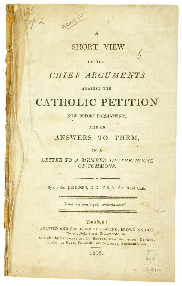 One of myriad polemical tracts penned by Catholic controversialist John Milner (1752-1826), who, after receiving his clerical training in Douais, France, returned to London where he immediately began a career of publishing pamphlets attacking the liberal-leaning Cisalpine Catholics, protestant dissenters, and any and all others who strayed from his rigidly orthodox interpretation of the Catholic faith.