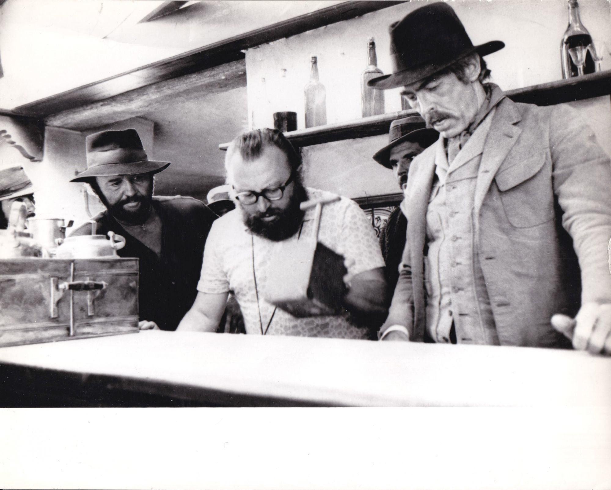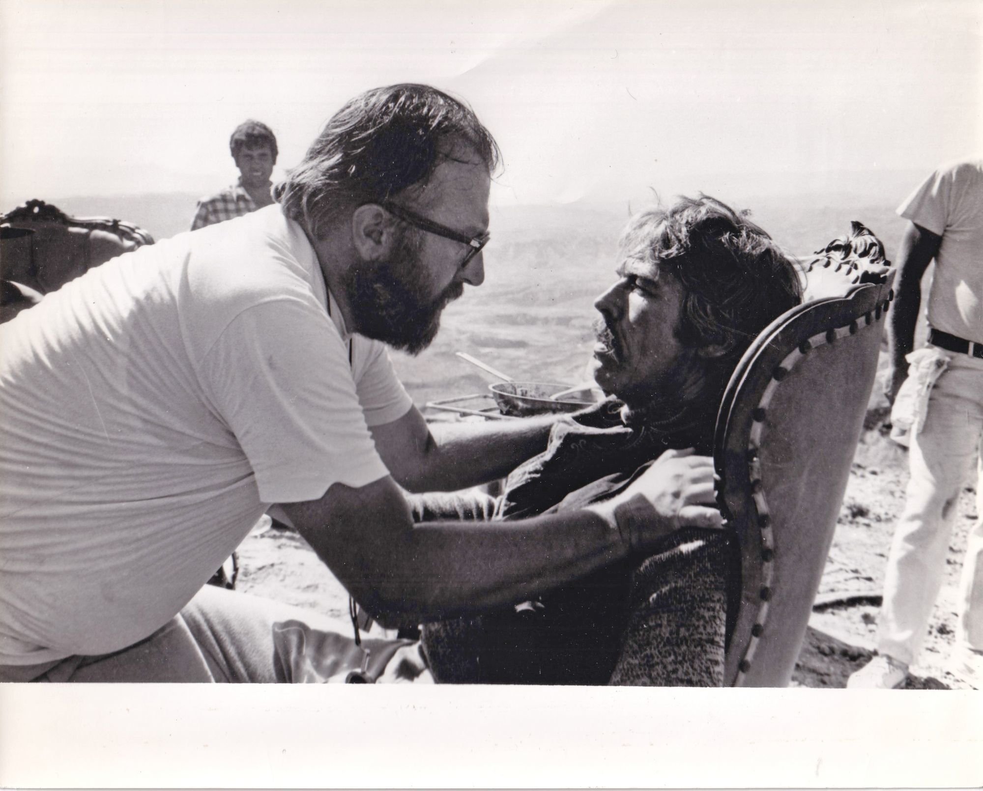 N.p.: N.p., 1971. Two vintage borderless reference photographs of director Sergio Leone on the set of the 1971 film, one showing Leone with actor James Coburn, the other showing Leone with Coburn and actor Rod Stieger.
